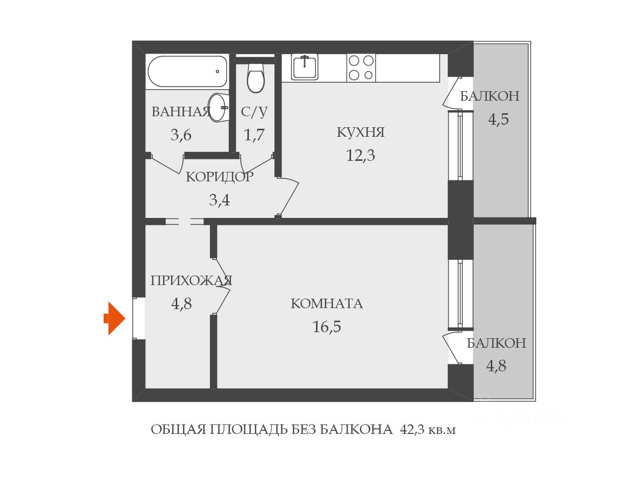 Квартира просторная с большой кухней и санузлами. Это индивидуальный проект. Все площади увеличены (кухня, коридор, санузлы, два глубоких балкона). Правильная квадратная форма комнаты и кухни.