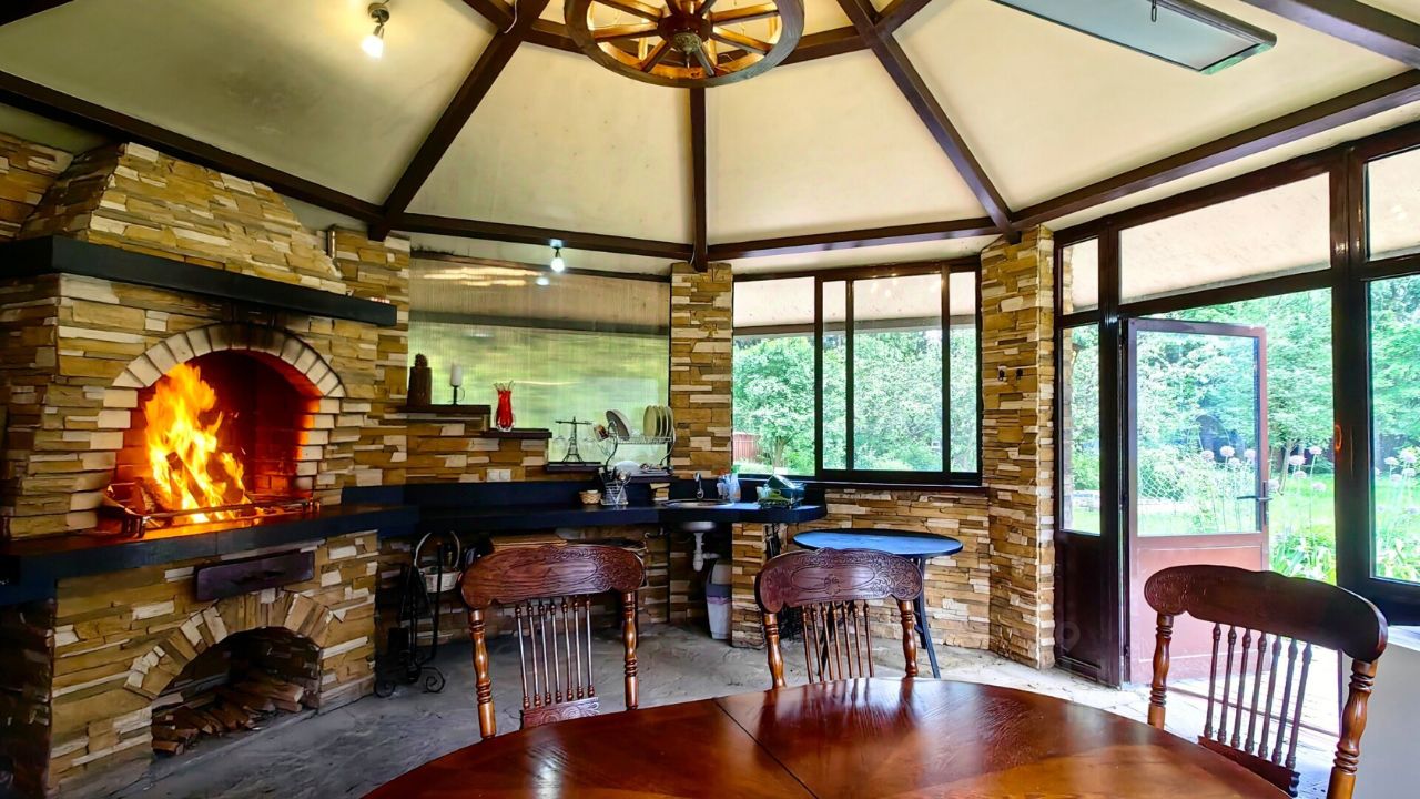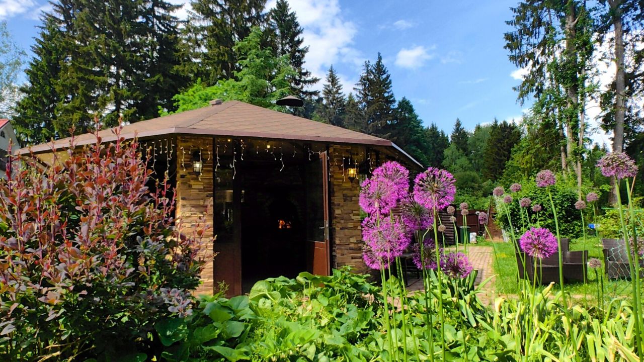 Уютная беседка (кирпич - камень) с мангалом площадью 32 кв.м. Просторный вольер для собаки. Домик для персонала.