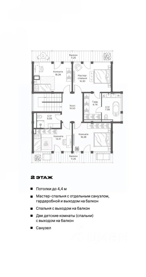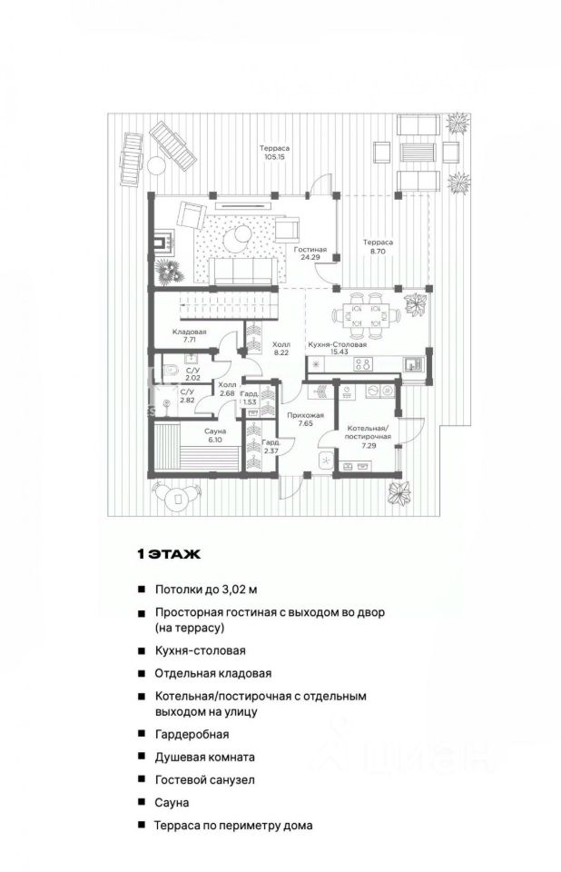 Планировка: Первый этаж: прихожая, кухня-столовая, гостиная с выходом на террасу, сауна с санузлом, гардеробная, санузел, котельная. Второй этаж: мастер-спальня с гардеробной и санузлом, детская комната с балконом, гостевая комната с балконом, кабинет с балконом, санузел.