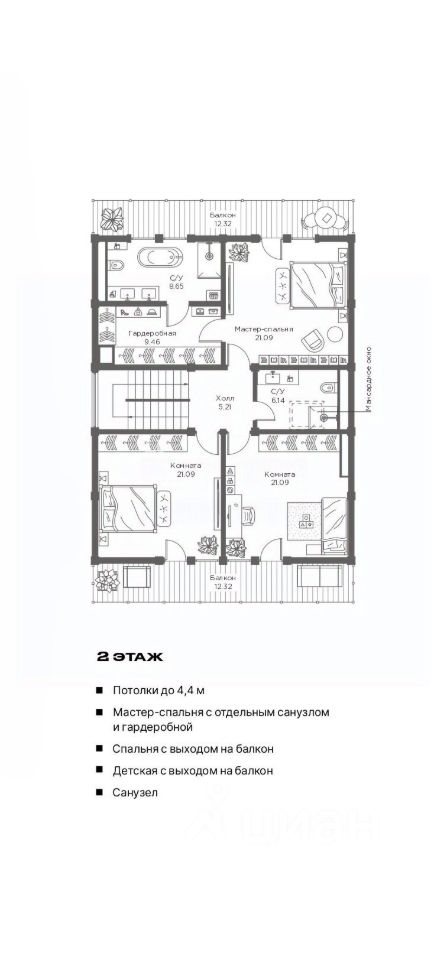 Планировка: Первый этаж: прихожая, кухня-столовая, гостиная с выходом на террасу, кабинет, гардеробная, санузел, котельная. Второй этаж: мастер-спальня с гардеробной и санузлом, детская комната с балконом, гостевая комната с балконом, санузел.