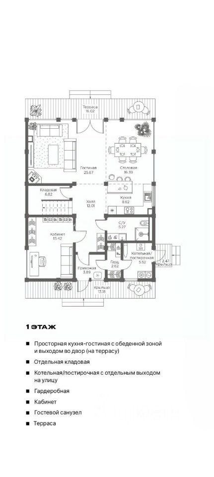 Планировка дома продумана до мелочей. На первом этаже располагается просторная кухня-гостиная с обеденной зоной и выходом на террасу, где можно устраивать уютные вечера на свежем воздухе. Дополнительно на первом этаже располагается кабинет, гардеробная, санузел и котельная с отдельным выходом на улицу. На втором этаже расположена мастер-спальня с собственной гардеробной и санузлом, а также две уютные комнаты с балконами и еще один санузел.