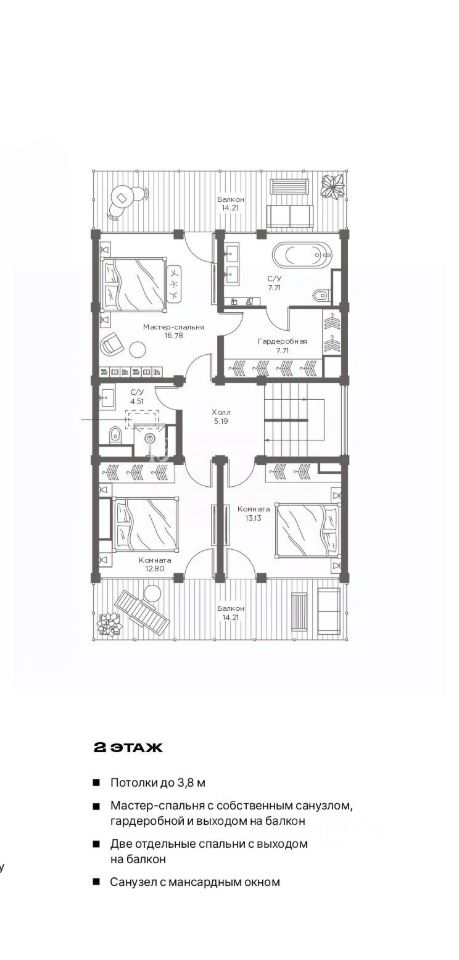 Планировка: Первый этаж: прихожая, холл, кухня, гостиная-столовая с выходом на террасу, кладовая, санузел, котельная. Второй этаж: мастер-спальня с гардеробной и санузлом, детская комната с балконом, гостевая комната с балконом, кабинет с балконом, санузел.