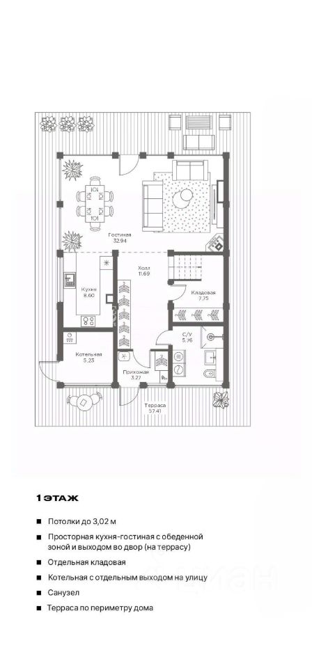 Планировка дома продумана до мелочей. На первом этаже располагается просторная гостиная с обеденной зоной, кухня, кладовая комната, санузел и котельная с отдельным отдельным выходом на улицу. По всему периметру дома предусмотрена терраса, где можно устраивать уютные вечера на свежем воздухе. На втором этаже расположена четыре комнаты, одна из них мастер-спальня с собственной гардеробной и санузлом, а также один санузел на остальные три комнаты.