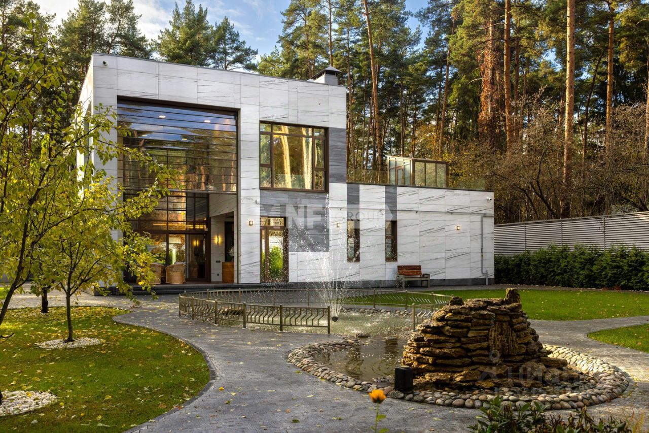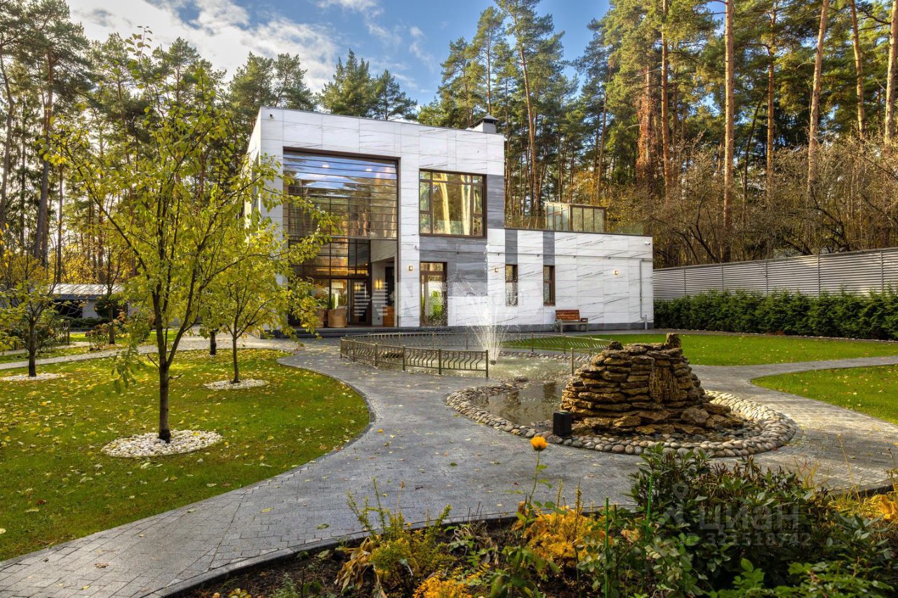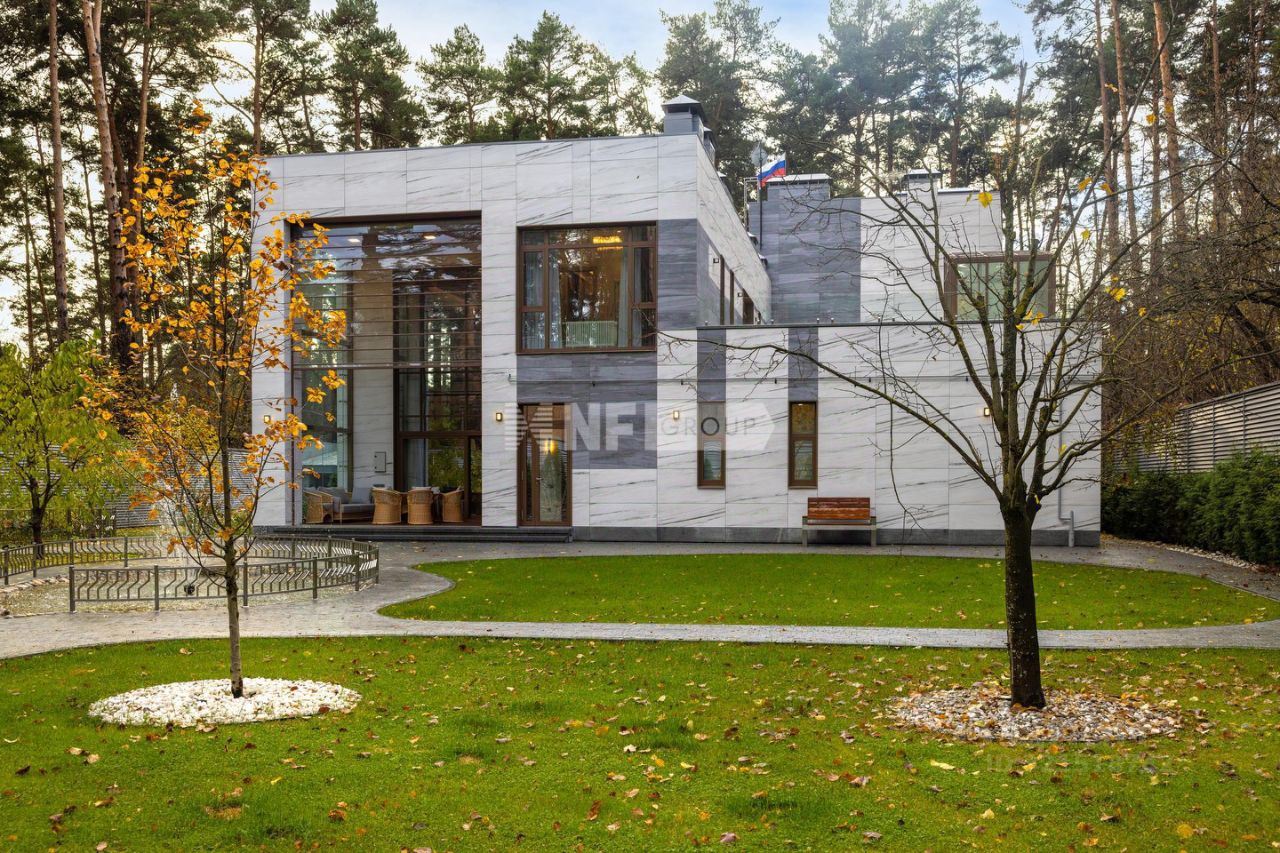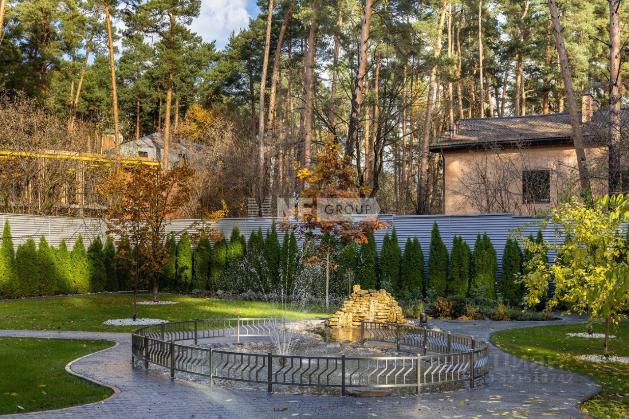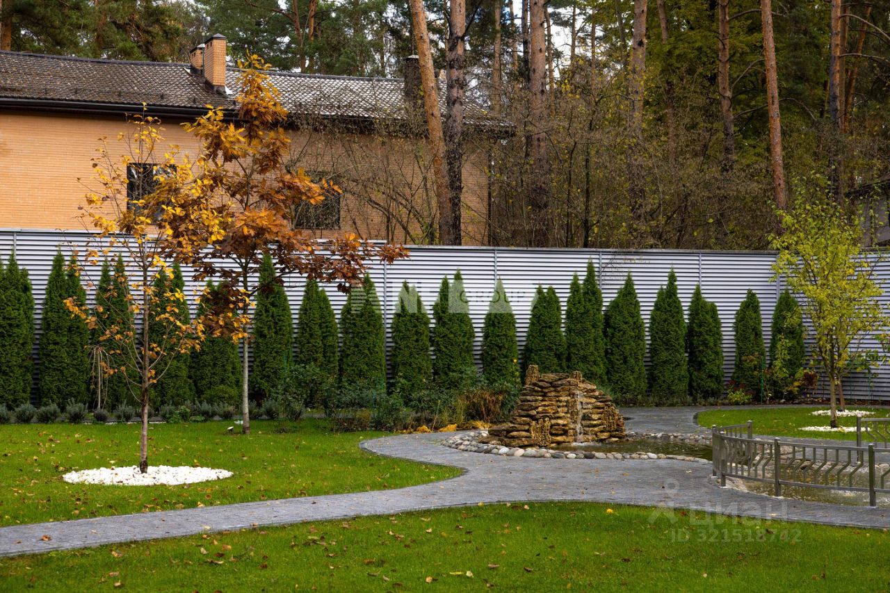 Резиденция располагается на земельном участке в 24 сотки с выполненными ландшафтным дизайном и зонированием: парк с ценными породами деревьев, плодовый сад, поляна, малинник с созреванием ягод весь сезон, цветочные и вечнозеленые клумбы, с расположенным в центре каскадным прудом с водопадом и фонтаном, периметр из вечнозеленых туй. Всё созданное эко-пространство имеет автоматический автополив и ночную подсветку, объединено плавными дорожками из термообработанной брусчатки.