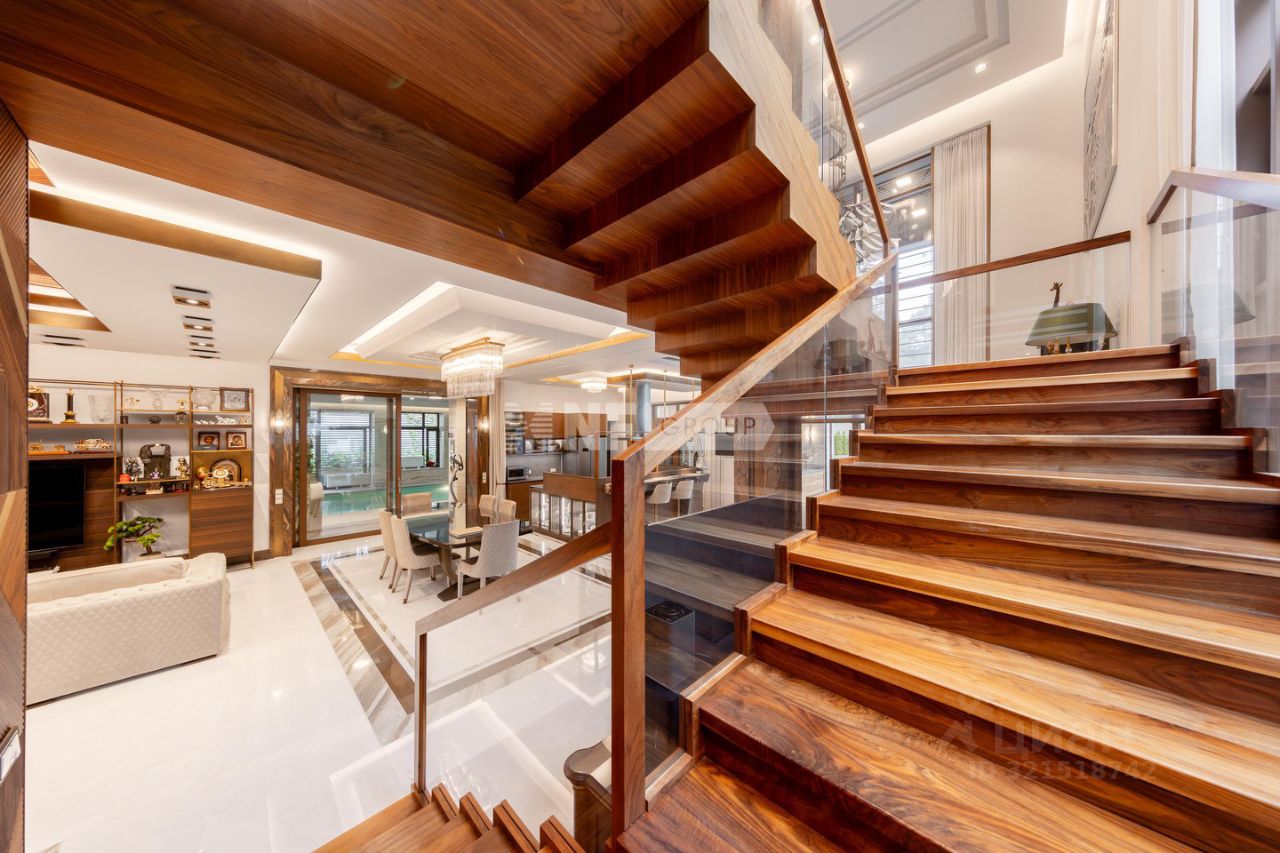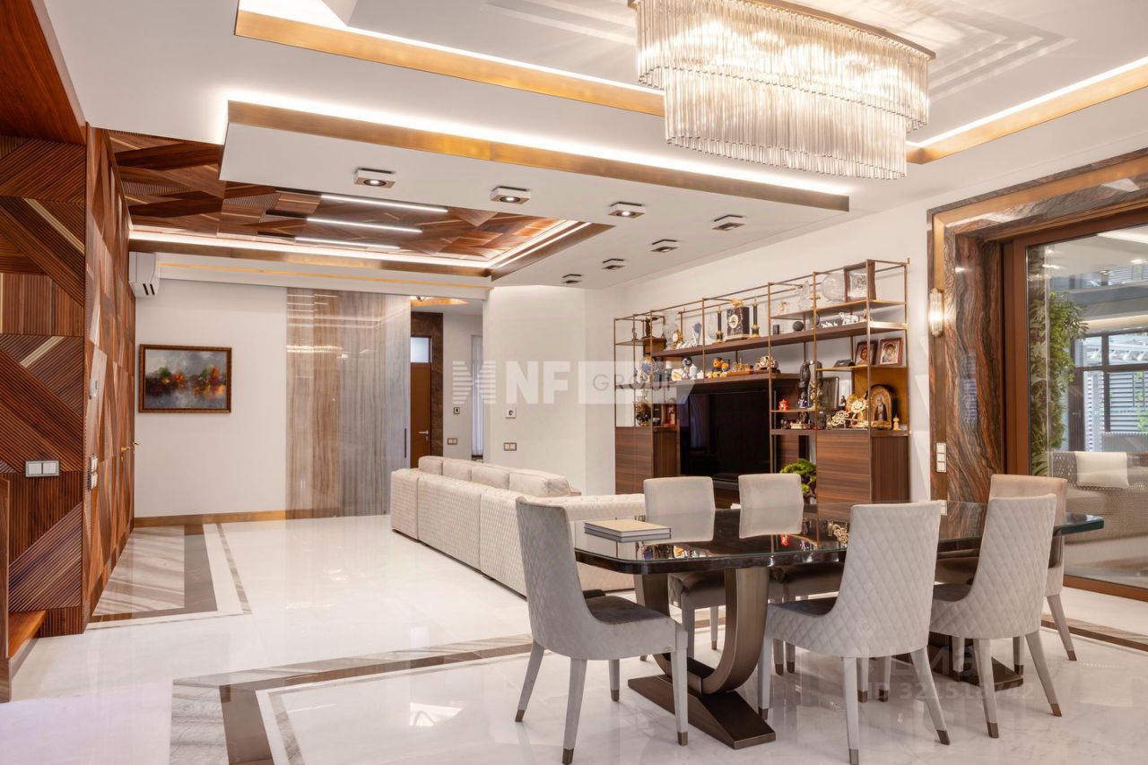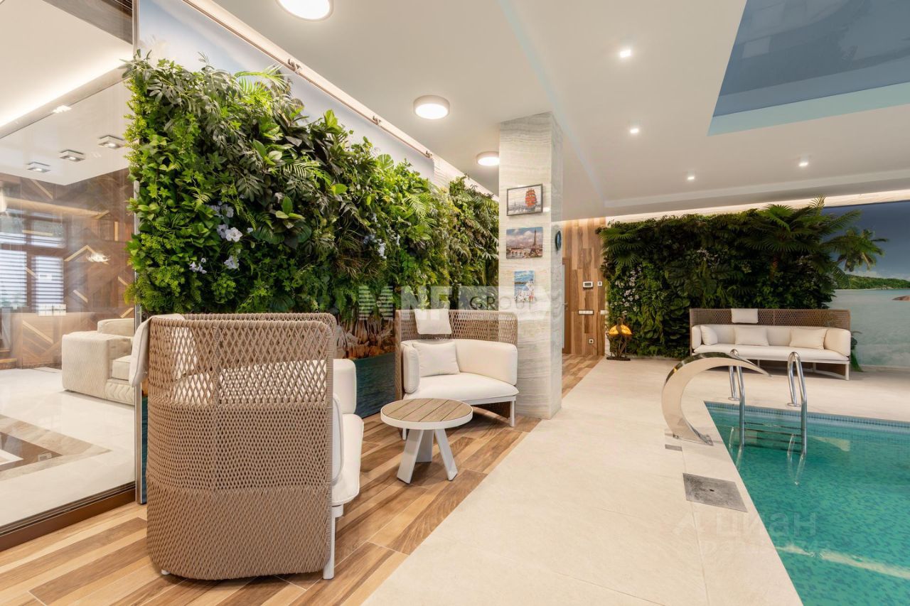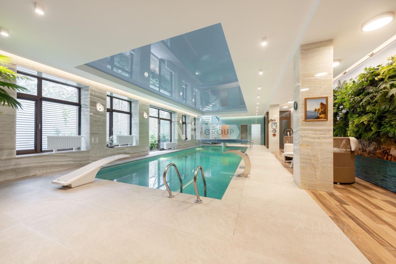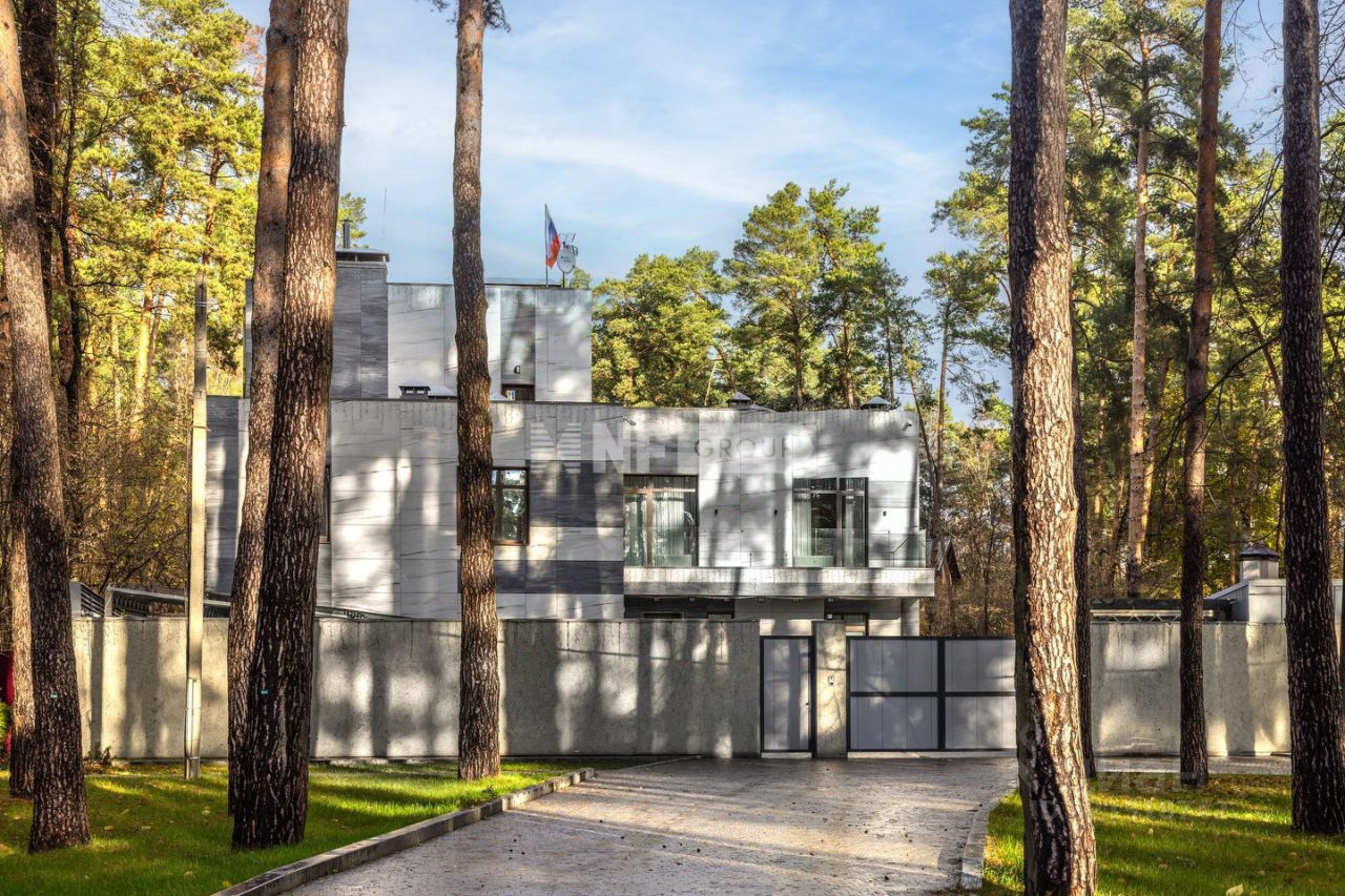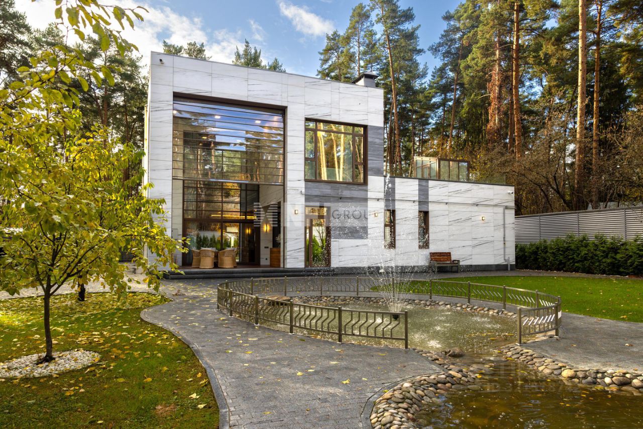 Резиденция располагается на земельном участке в 24 сотки с выполненными ландшафтным дизайном и зонированием: парк с ценными породами деревьев, плодовый сад, поляна, малинник с созреванием ягод весь сезон, цветочные и вечнозеленые клумбы, с расположенным в центре каскадным прудом с водопадом и фонтаном, периметр из вечнозеленых туй. Всё созданное эко-пространство имеет автоматический автополив и ночную подсветку, объединено плавными дорожками из термообработанной брусчатки.