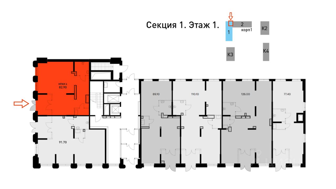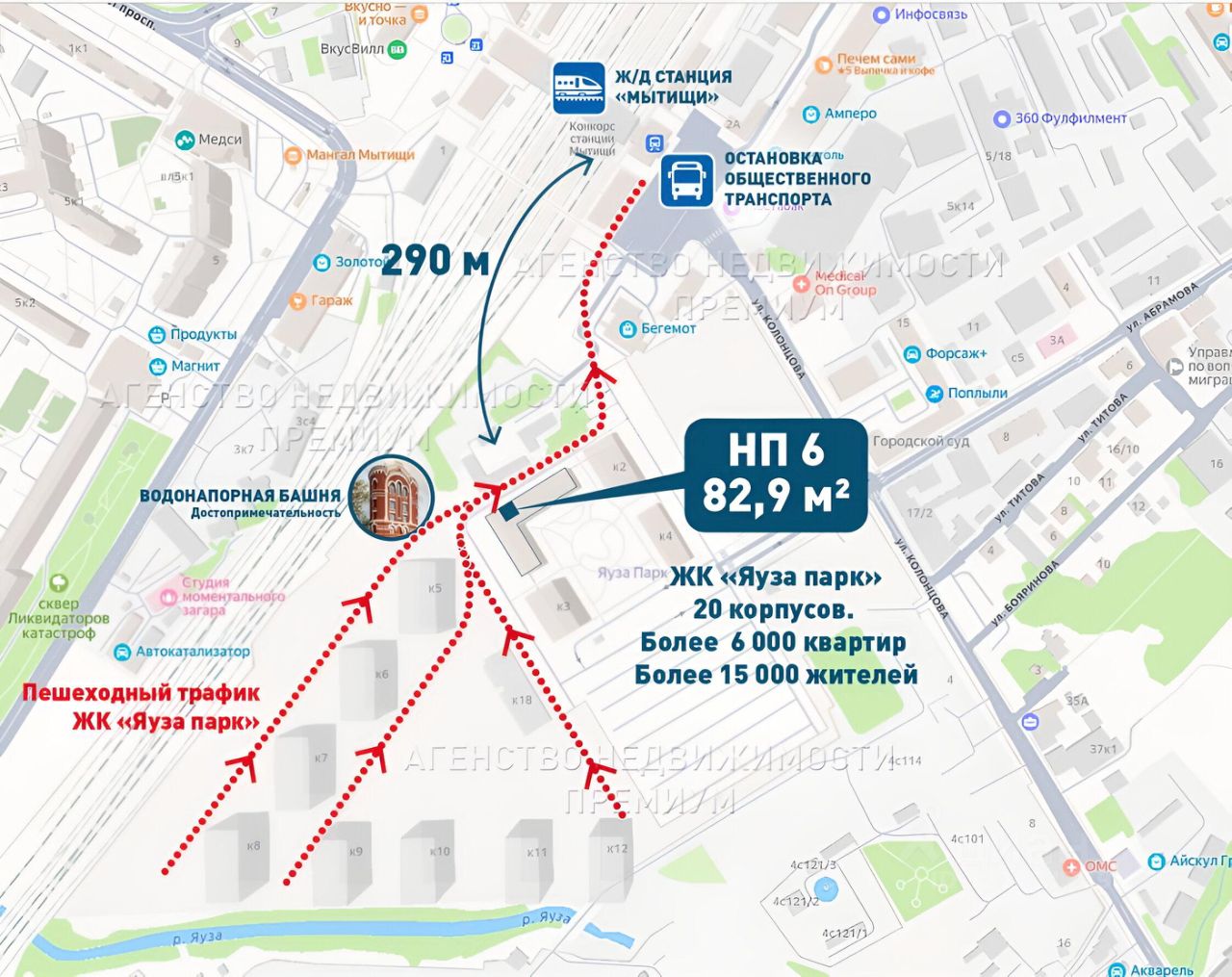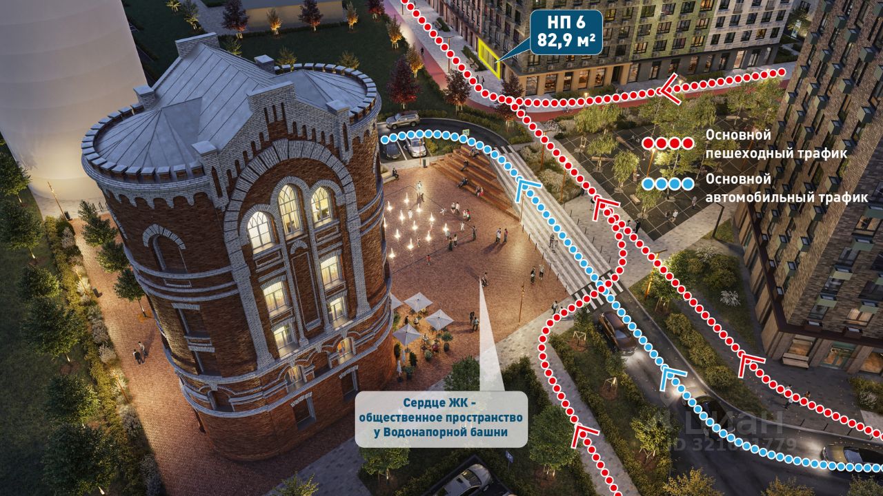 СДАЕТСЯ ОТЛИЧНОЕ ПОМЕЩЕНИЕ площадью 82,9 м2 на 1 этаже, с возможностью объединения соседней площади до 174,6 м2. Успех любого вашего бизнеса обеспечит УНИКАЛЬНОЕ РАСПОЛОЖЕНИЕ ДАННОГО ПОМЕЩЕНИЯ. Большая часть пешеходного трафика всего ЖК Яуза парк в сторону Ж/Д станции Мытищи (не более 3 минут ходьбы!) и остановок общественного транспорта будет проходить вдоль фасада здания перед вашими широкими витринами. ДОПОЛНИТЕЛЬНЫМ ЦЕНТРОМ ПРИТЯЖЕНИЯ ваших посетителей станет сердце жилого комплекса - уникальное общественное пространство, которое будет создано вокруг отреставрированной водонапорной башни XIX века прямо напротив вашего помещения.