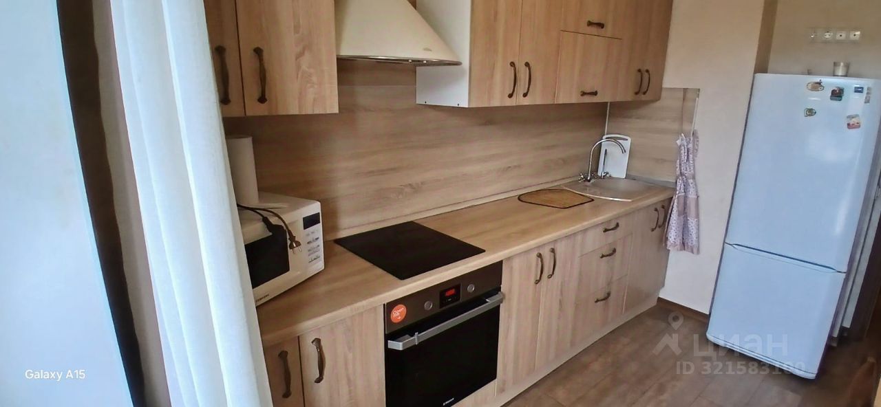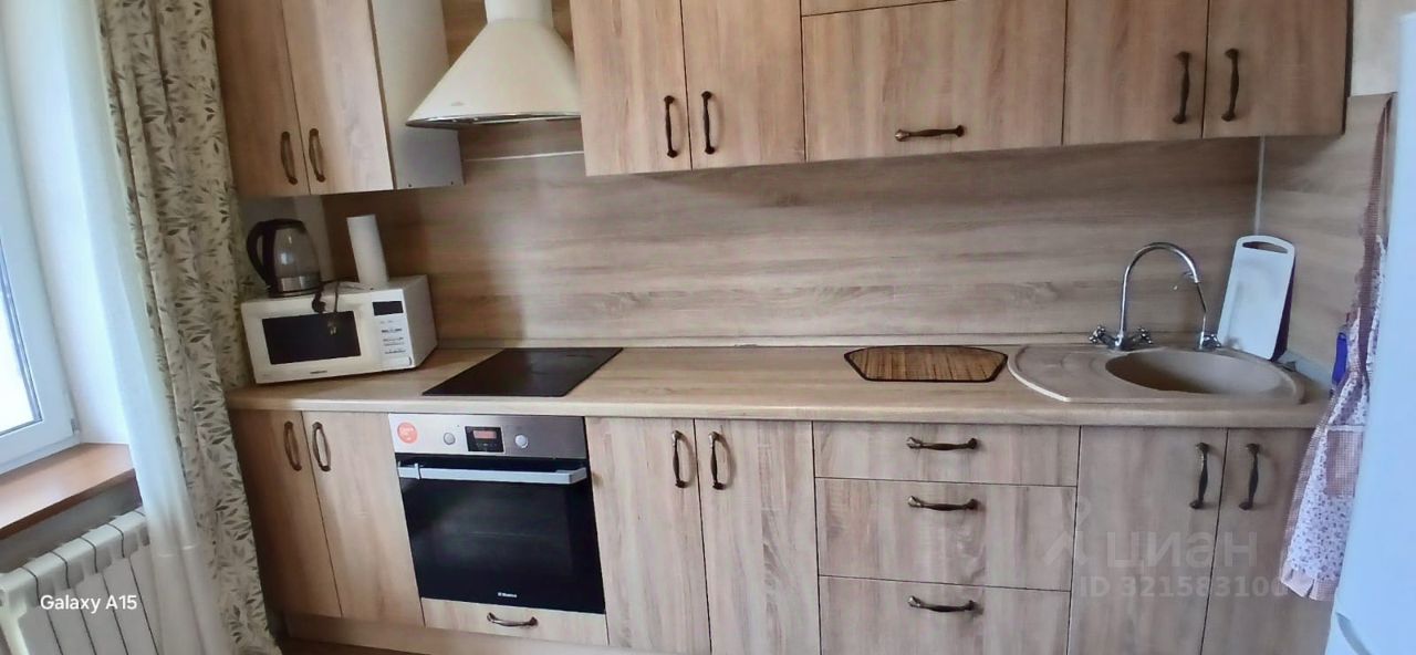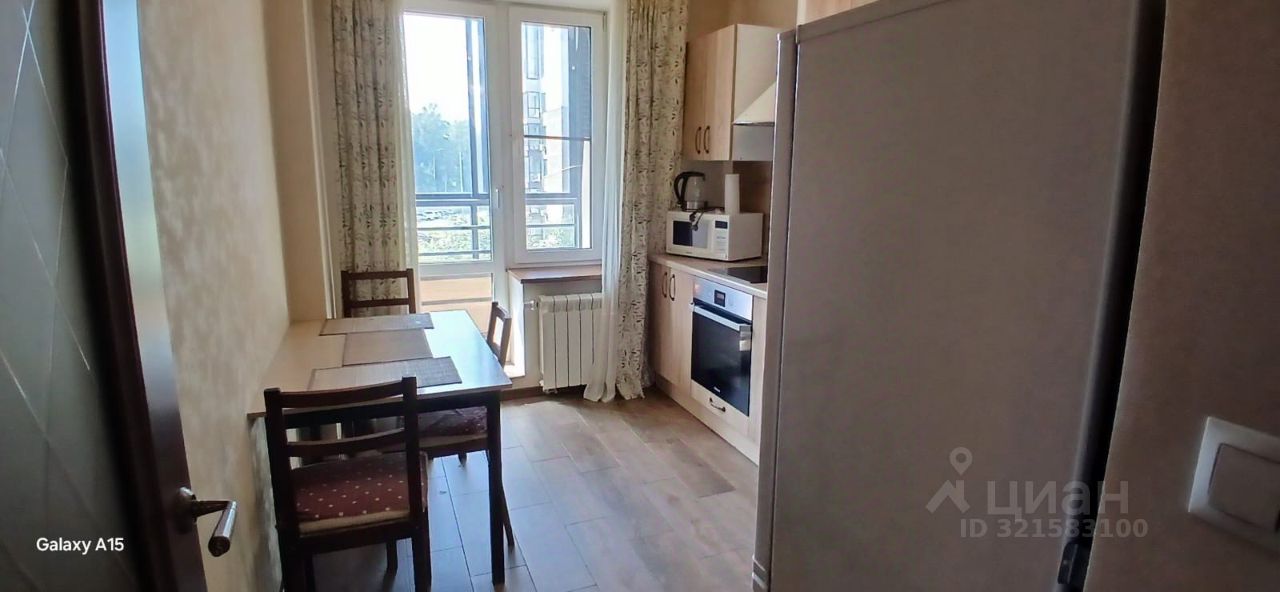 Кухня - встроенный кухонный гарнитур, 2-х камерный холодильник, варочная панель, жарочный шкаф, микроволновая печь, электрочайник. Обеденный стол и стулья.
