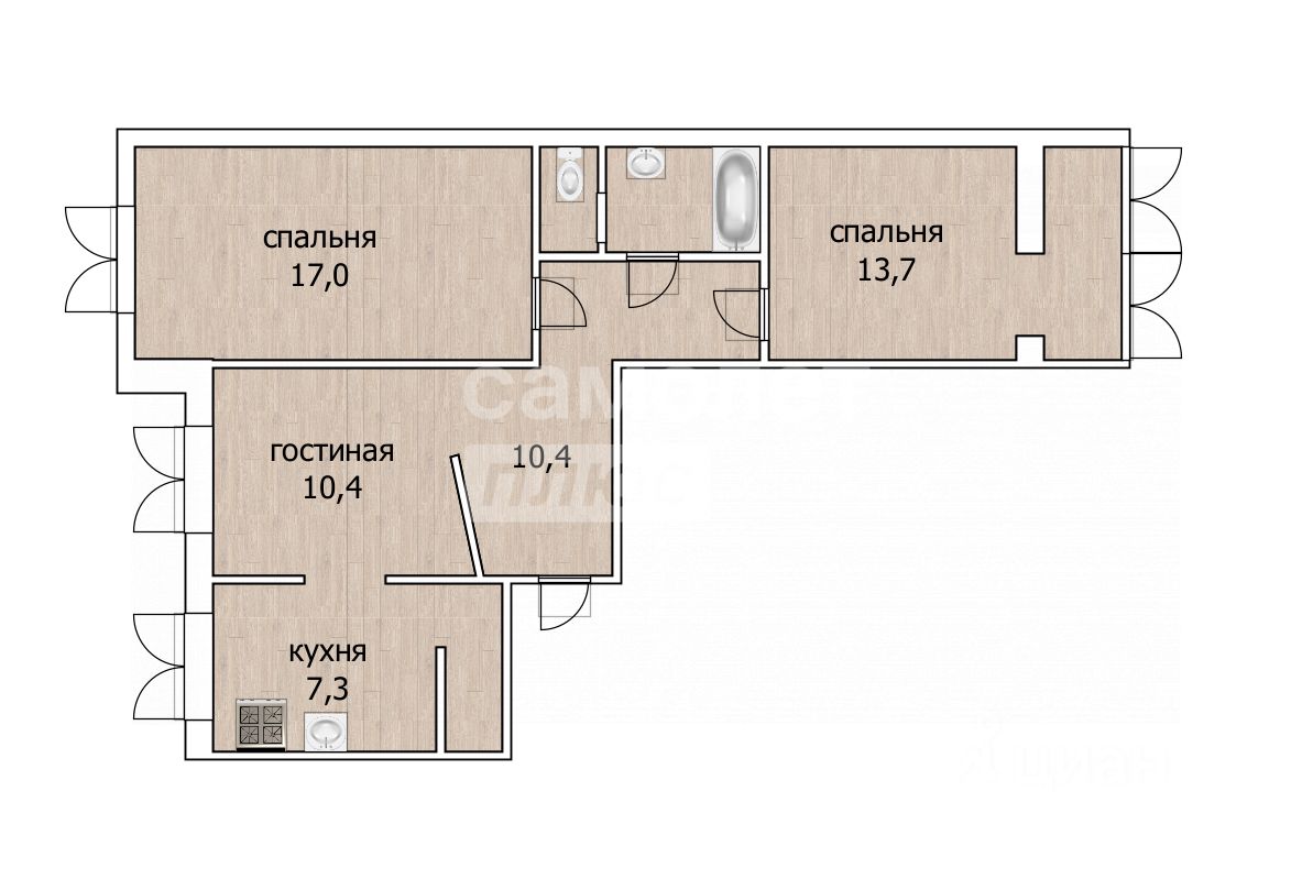 О квартире: Общая площадь квартиры 64.6 кв.м. Просторная кухня- гостиная площадью 17.7 кв.м. и комнаты площадью 17 и 13.7 кв.м. Сан.узел совмещенный с большой ванной, отделан плиткой. В прихожей стоит большой шкаф для верхней одежды и обуви. Удобно, что грязная зона прихожей находится отдельно и не пересекается с основными маршрутами по квартире.