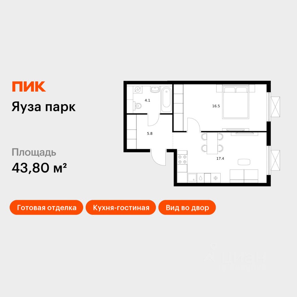 Продаётся 1-комн. квартира площадью 43,8 кв.м на 18 этаже 24 этажного дома (Корпус 5, Секция 1) проекта ПИК Яуза парк. Светлый просторный подъезд на уровне земли, функциональная планировка, большие окна, c отделкой.