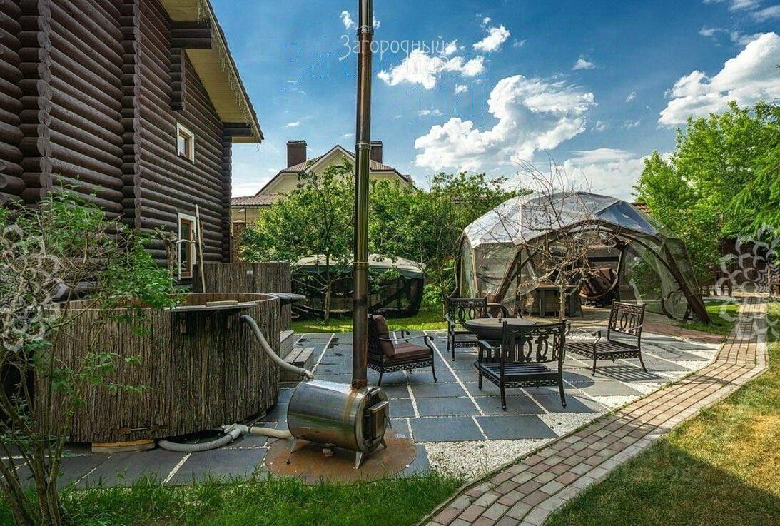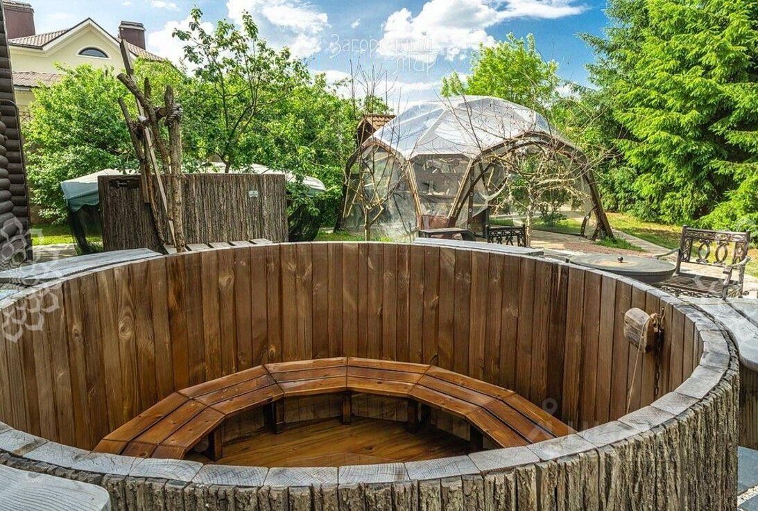 Зона отдыха премиум-класса: •Дизайнерский шатер с маркизами от солнца. Проект полностью электрифицирован: контурная подсветка, розетки для комфортного времяпрепровождения. •Летний домик для уединенного отдыха. •Профессиональная зона барбекю: оснащена мангалом, дровяной печью, просторной столешницей для готовки и раковиной. •Легендарная банно-купельная зона: Авторский проект ''Самая умная баня в мире'' с двумя уличными купелями (холодная для ныряния и теплая на 8 человек), системой автоматического наполнения и подогрева. Для полного погружения найдите видеообзор в сети.
