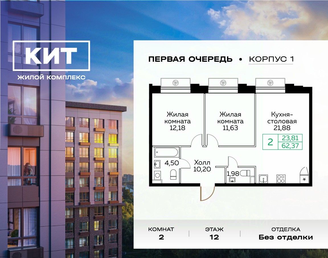 Продаётся 2-к квартира 62.3 кв.м. без отделки в ЖК ''КИТ'' на 12-м этаже 25 этажного дома. Жилой комплекс ''Кит'' спроектирован в урбанистической концепции ''Город в Городе''. Объект бизнес-класса предлагает рациональный подход к набору опций, необходимых для гармоничной жизни. Проект представляет собой два корпуса, которые образуют единую приватную территорию. Ее доминантой является двор с красивым ландшафтным дизайном и различными зонами, ориентированными на интересы жителей разного возраста. При создании пространства в приоритет ставился комфорт жителей. В шаговой доступности находятся торговый центр, рестораны, кинотеатры, спортивный зал, образовательные учреждения и много других сфер услуг.