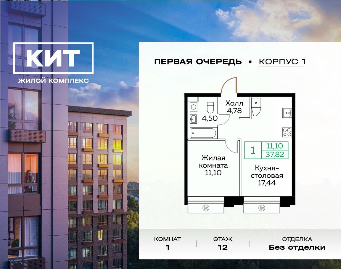 Продаётся 1-к квартира 37.9 кв.м. без отделки в ЖК ''КИТ'' на 12-м этаже 25 этажного дома. Жилой комплекс ''Кит'' спроектирован в урбанистической концепции ''Город в Городе''. Объект бизнес-класса предлагает рациональный подход к набору опций, необходимых для гармоничной жизни. Проект представляет собой два корпуса, которые образуют единую приватную территорию. Ее доминантой является двор с красивым ландшафтным дизайном и различными зонами, ориентированными на интересы жителей разного возраста. При создании пространства в приоритет ставился комфорт жителей. В шаговой доступности находятся торговый центр, рестораны, кинотеатры, спортивный зал, образовательные учреждения и много других сфер услуг.