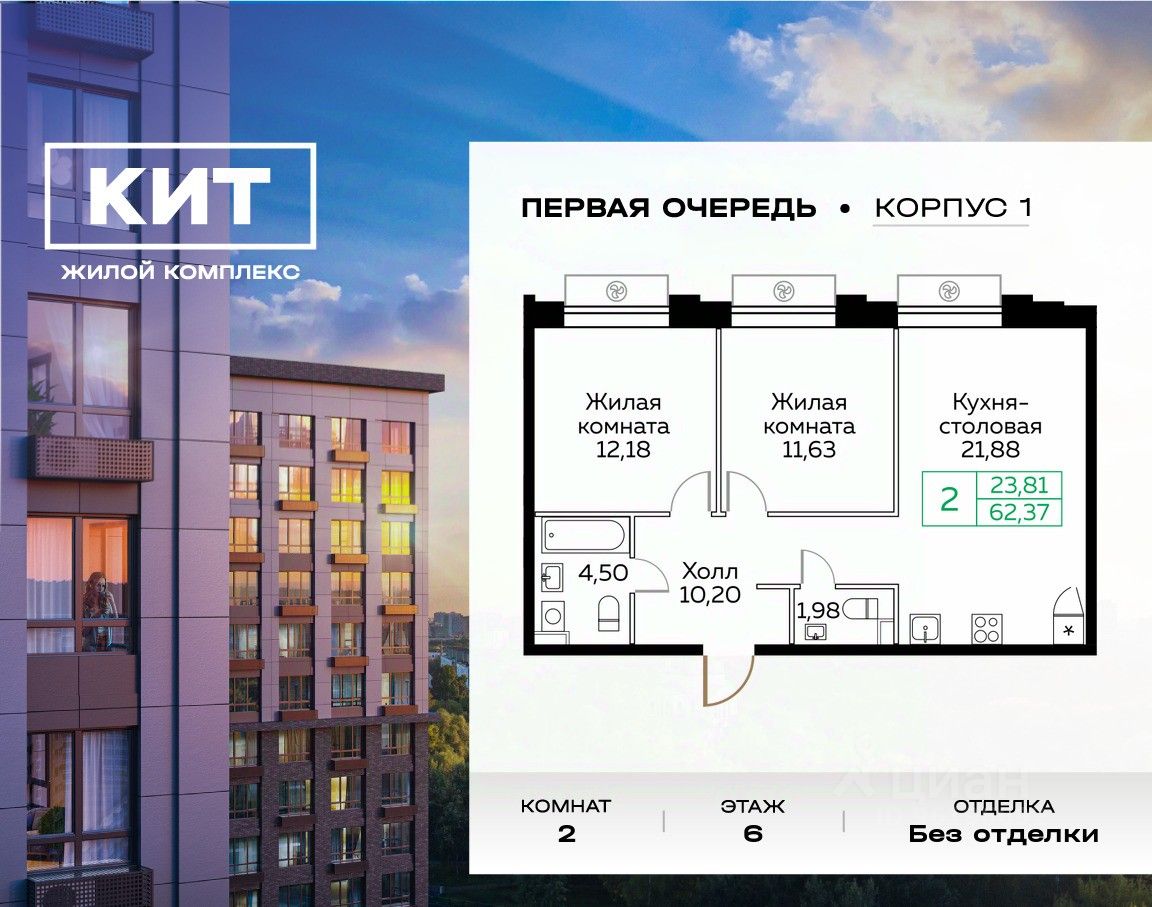Продаётся 2-к квартира 62.3 кв.м. без отделки в ЖК ''КИТ'' на 6-м этаже 25 этажного дома. Жилой комплекс ''Кит'' спроектирован в урбанистической концепции ''Город в Городе''. Объект бизнес-класса предлагает рациональный подход к набору опций, необходимых для гармоничной жизни. Проект представляет собой два корпуса, которые образуют единую приватную территорию. Ее доминантой является двор с красивым ландшафтным дизайном и различными зонами, ориентированными на интересы жителей разного возраста. При создании пространства в приоритет ставился комфорт жителей. В шаговой доступности находятся торговый центр, рестораны, кинотеатры, спортивный зал, образовательные учреждения и много других сфер услуг.