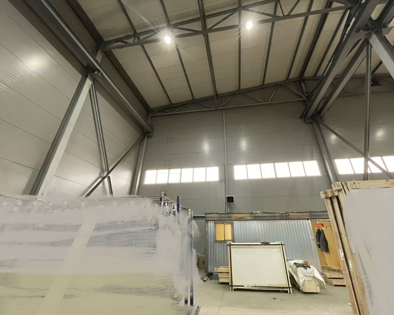 Часть складского помещения, площадь 500-700 кв.м., + кабинет 14 кв.м. Ворота под грузовой авто, высота потолков 10 м. На территории есть парковка.