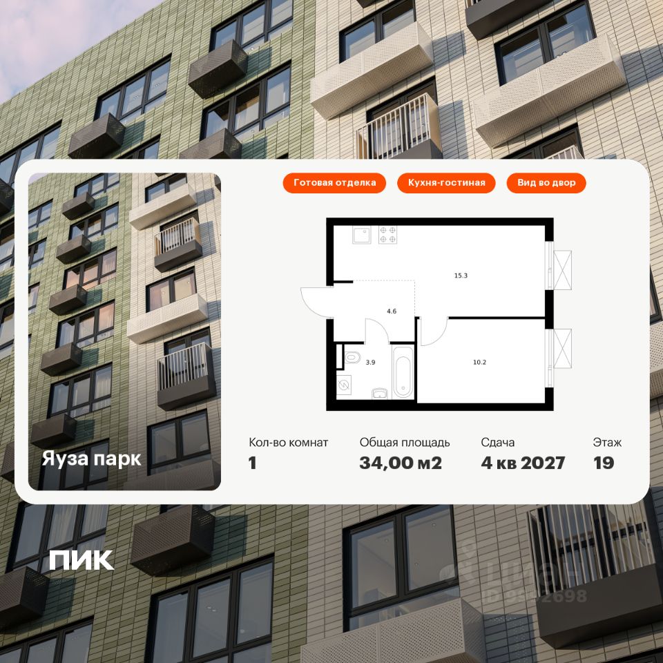 Продаётся 1-комн. квартира площадью 34 кв.м на 19 этаже 24 этажного дома (Корпус 7, Секция 1) проекта ПИК Яуза парк. Светлый просторный подъезд на уровне земли, функциональная планировка, большие окна, c отделкой.