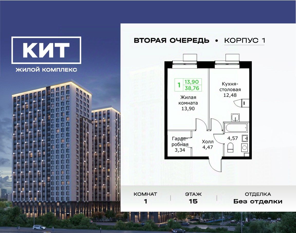 Продаётся 1-к квартира 38.76 кв.м. без отделки в ЖК ''КИТ2'' на 15-м этаже 25 этажного дома.Жилой комплекс ''Кит 2'' спроектирован в урбанистической концепции ''Город в Городе''. Объект бизнес-класса предлагает рациональный подход к набору опций, необходимых для гармоничной жизни. Проект представляет собой два корпуса, которые образуют единую приватную территорию. Ее доминантой является двор с красивым ландшафтным дизайном и различными зонами, ориентированными на интересы жителей разного возраста. При создании пространства в приоритет ставился комфорт жителей. В шаговой доступности находятся: торговый центр, рестораны, кинотеатры, спортивный зал, образовательные учреждения и множество других объектов в сфере услуг.