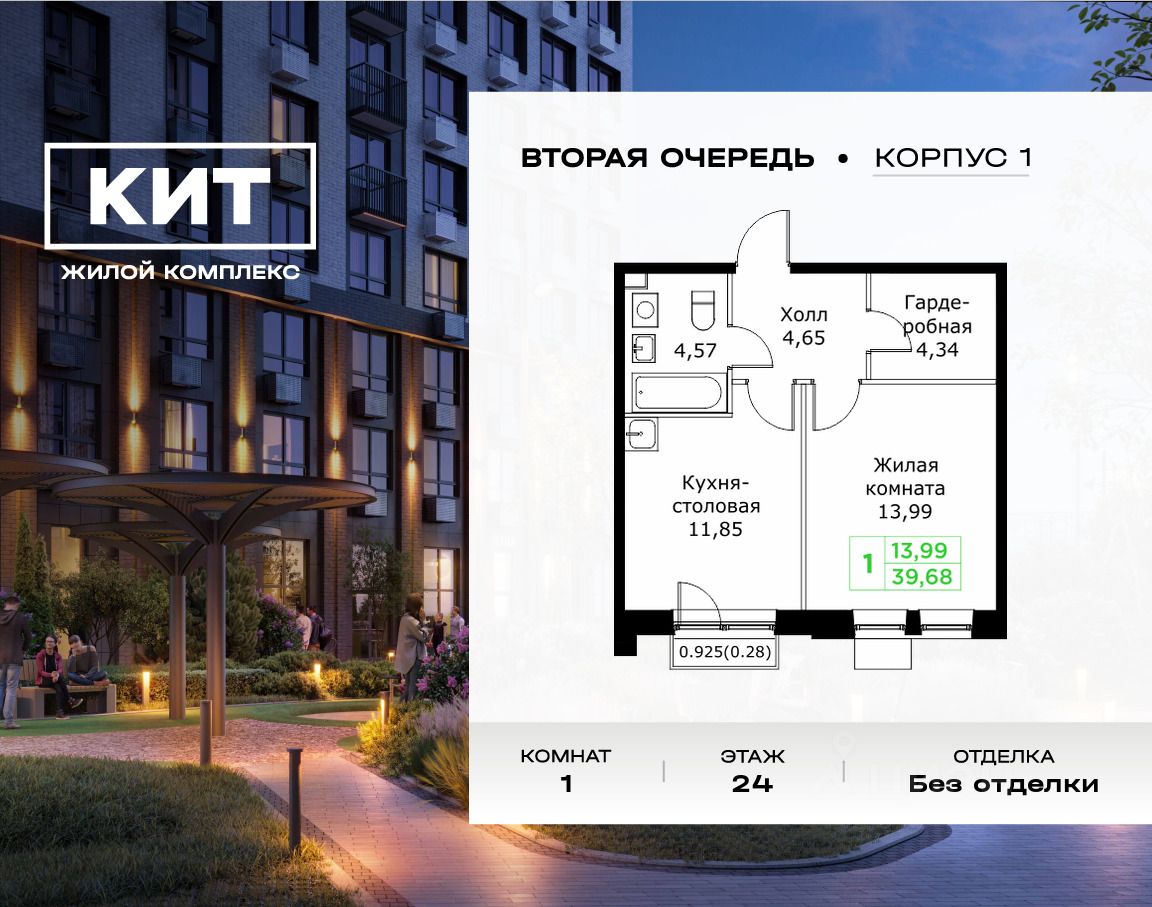 Продаётся 1-к квартира 39.68 кв.м. без отделки в ЖК ''КИТ2'' на 24-м этаже 25 этажного дома.Жилой комплекс ''Кит 2'' спроектирован в урбанистической концепции ''Город в Городе''. Объект бизнес-класса предлагает рациональный подход к набору опций, необходимых для гармоничной жизни. Проект представляет собой два корпуса, которые образуют единую приватную территорию. Ее доминантой является двор с красивым ландшафтным дизайном и различными зонами, ориентированными на интересы жителей разного возраста. При создании пространства в приоритет ставился комфорт жителей. В шаговой доступности находятся: торговый центр, рестораны, кинотеатры, спортивный зал, образовательные учреждения и множество других объектов в сфере услуг.