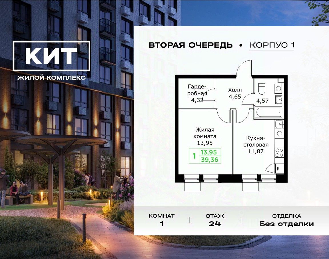 Продаётся 1-к квартира 39.36 кв.м. без отделки в ЖК ''КИТ2'' на 24-м этаже 25 этажного дома.Жилой комплекс ''Кит 2'' спроектирован в урбанистической концепции ''Город в Городе''. Объект бизнес-класса предлагает рациональный подход к набору опций, необходимых для гармоничной жизни. Проект представляет собой два корпуса, которые образуют единую приватную территорию. Ее доминантой является двор с красивым ландшафтным дизайном и различными зонами, ориентированными на интересы жителей разного возраста. При создании пространства в приоритет ставился комфорт жителей. В шаговой доступности находятся: торговый центр, рестораны, кинотеатры, спортивный зал, образовательные учреждения и множество других объектов в сфере услуг.