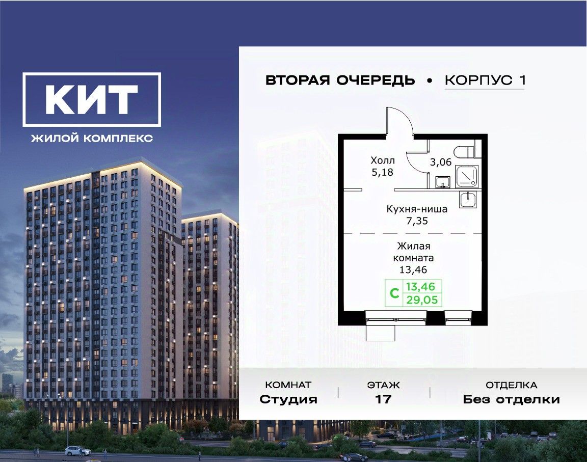 Продаётся студия 29.05 кв.м. без отделки в ЖК ''КИТ2'' на 17-м этаже 25 этажного дома.Жилой комплекс ''Кит 2'' спроектирован в урбанистической концепции ''Город в Городе''. Объект бизнес-класса предлагает рациональный подход к набору опций, необходимых для гармоничной жизни. Проект представляет собой два корпуса, которые образуют единую приватную территорию. Ее доминантой является двор с красивым ландшафтным дизайном и различными зонами, ориентированными на интересы жителей разного возраста. При создании пространства в приоритет ставился комфорт жителей. В шаговой доступности находятся: торговый центр, рестораны, кинотеатры, спортивный зал, образовательные учреждения и множество других объектов в сфере услуг.