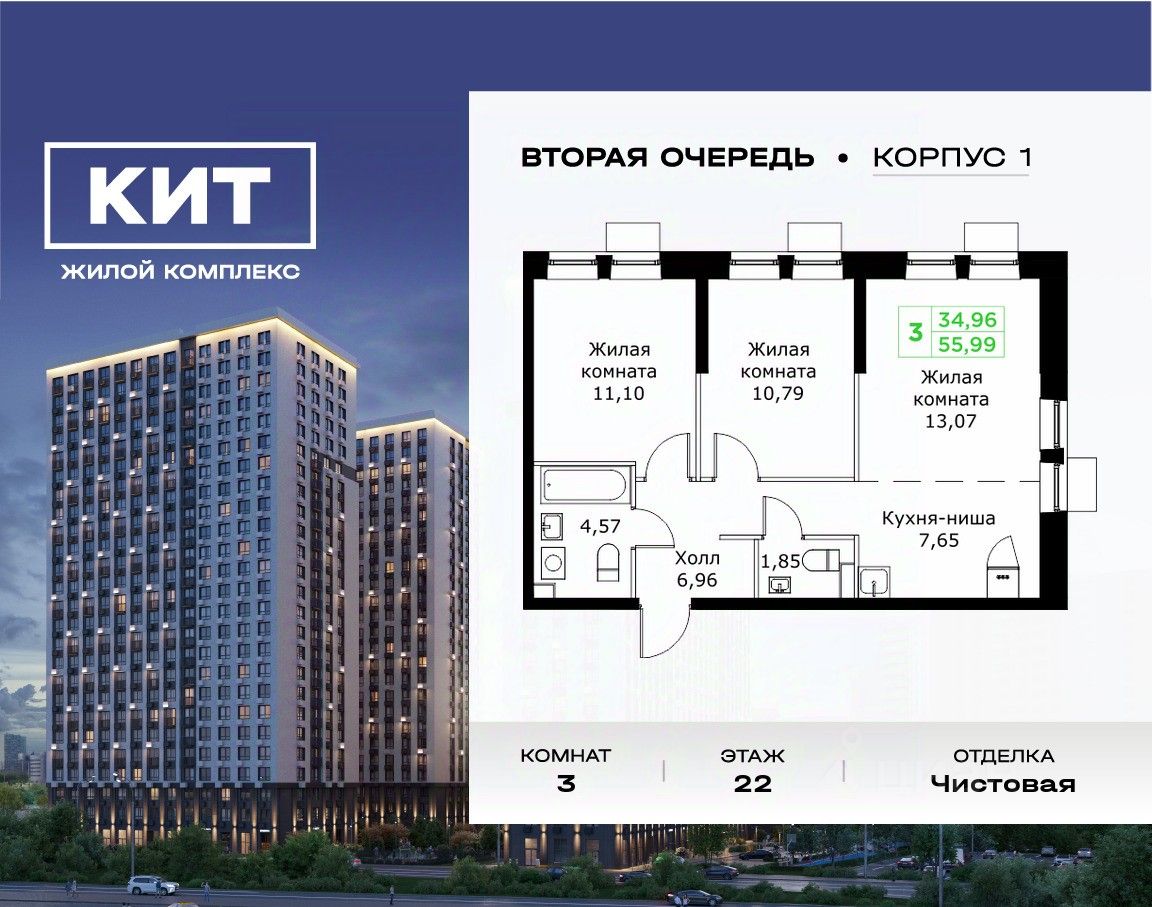 Продаётся 3-к квартира 55.99 кв.м. с чистовой отделкой в ЖК ''КИТ2'' на 22-м этаже 25 этажного дома.Жилой комплекс ''Кит 2'' спроектирован в урбанистической концепции ''Город в Городе''. Объект бизнес-класса предлагает рациональный подход к набору опций, необходимых для гармоничной жизни. Проект представляет собой два корпуса, которые образуют единую приватную территорию. Ее доминантой является двор с красивым ландшафтным дизайном и различными зонами, ориентированными на интересы жителей разного возраста. При создании пространства в приоритет ставился комфорт жителей. В шаговой доступности находятся: торговый центр, рестораны, кинотеатры, спортивный зал, образовательные учреждения и множество других объектов в сфере услуг.