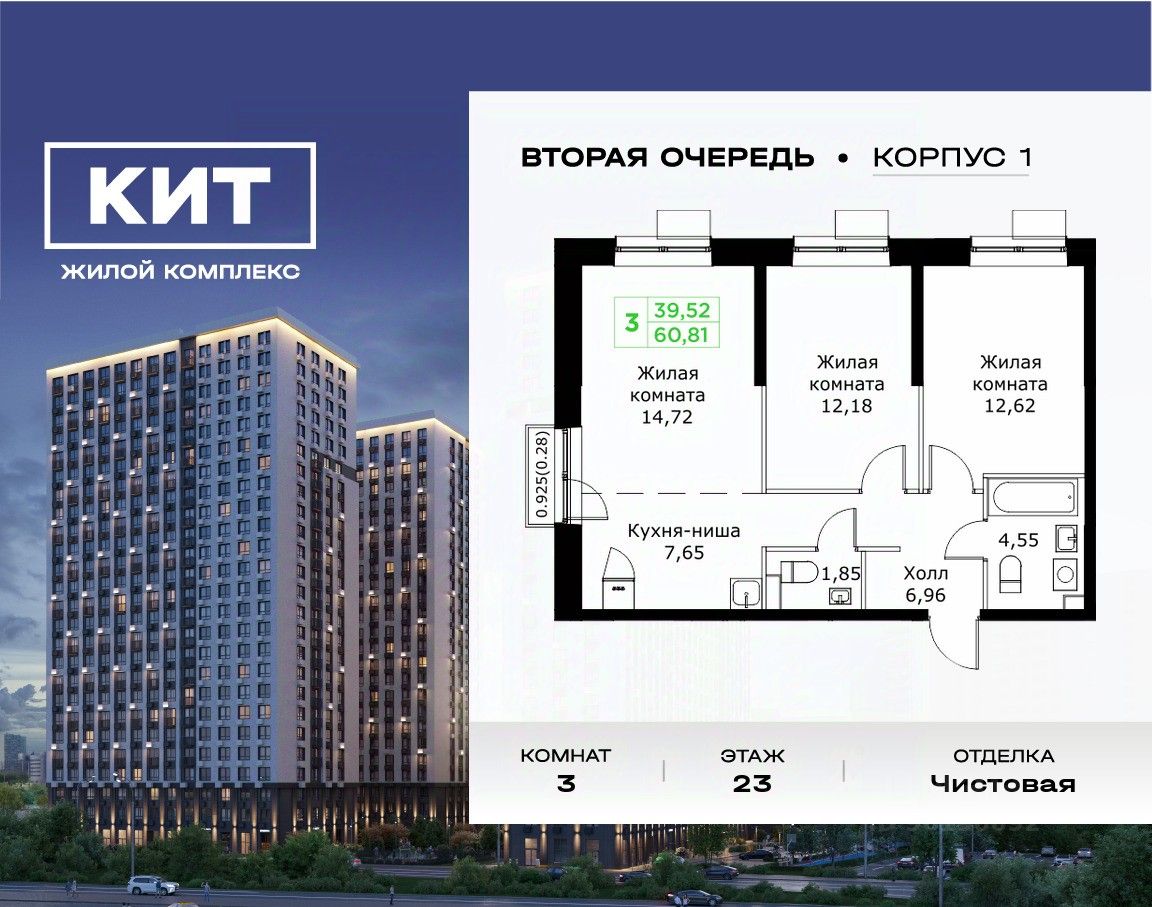 Продаётся 3-к квартира 60.81 кв.м. с чистовой отделкой в ЖК ''КИТ2'' на 23-м этаже 25 этажного дома.Жилой комплекс ''Кит 2'' спроектирован в урбанистической концепции ''Город в Городе''. Объект бизнес-класса предлагает рациональный подход к набору опций, необходимых для гармоничной жизни. Проект представляет собой два корпуса, которые образуют единую приватную территорию. Ее доминантой является двор с красивым ландшафтным дизайном и различными зонами, ориентированными на интересы жителей разного возраста. При создании пространства в приоритет ставился комфорт жителей. В шаговой доступности находятся: торговый центр, рестораны, кинотеатры, спортивный зал, образовательные учреждения и множество других объектов в сфере услуг.