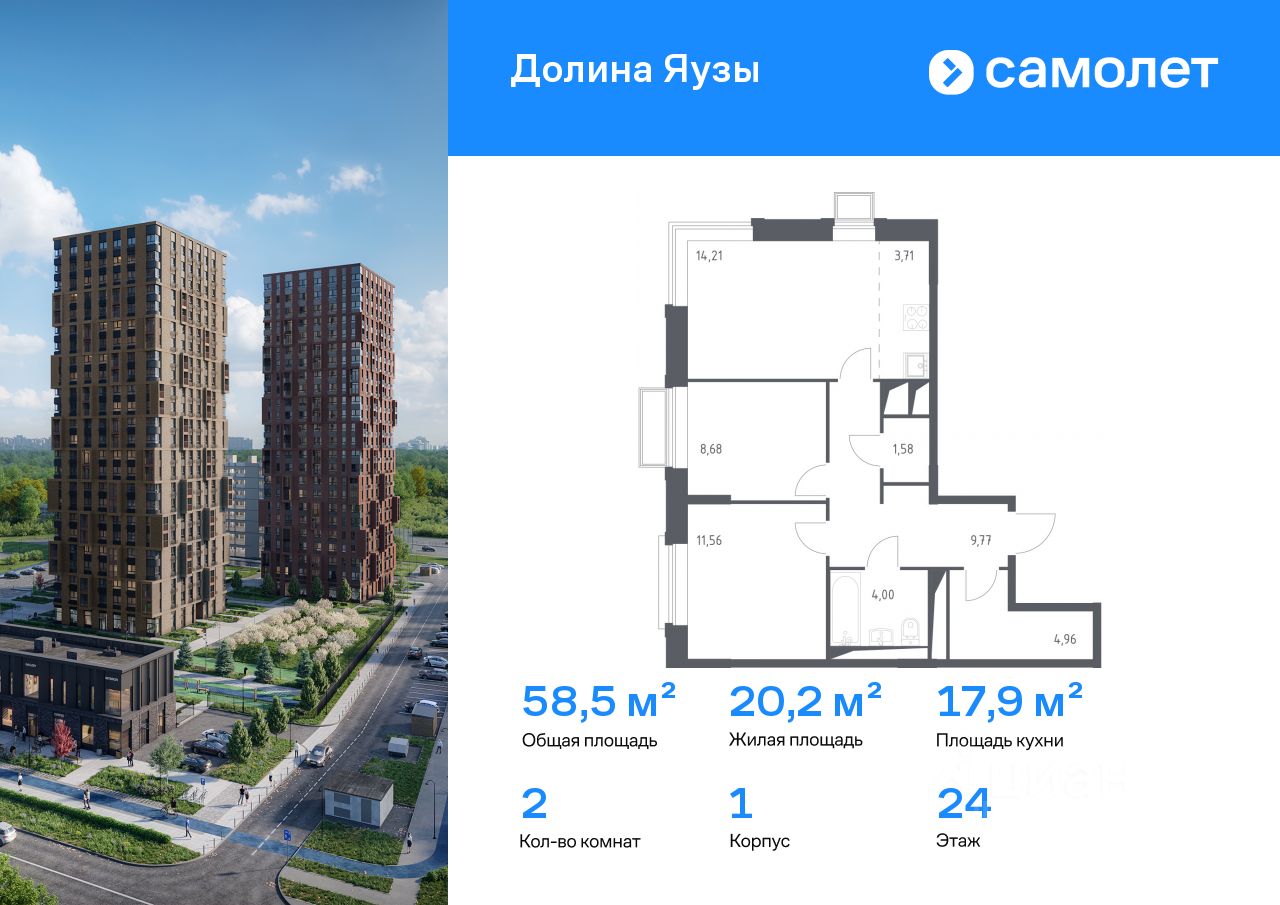 Строим кварталы для жизни с заботой о будущем. Предлагается 2-комнатная квартира комфорт-класса 58,47 кв.м в корпусе 1 на 24 этаже, в ЖК ''Долина Яузы'' Квартира с чистовой отделкой. Доступность дополнительных опций уточняйте у застройщика.
