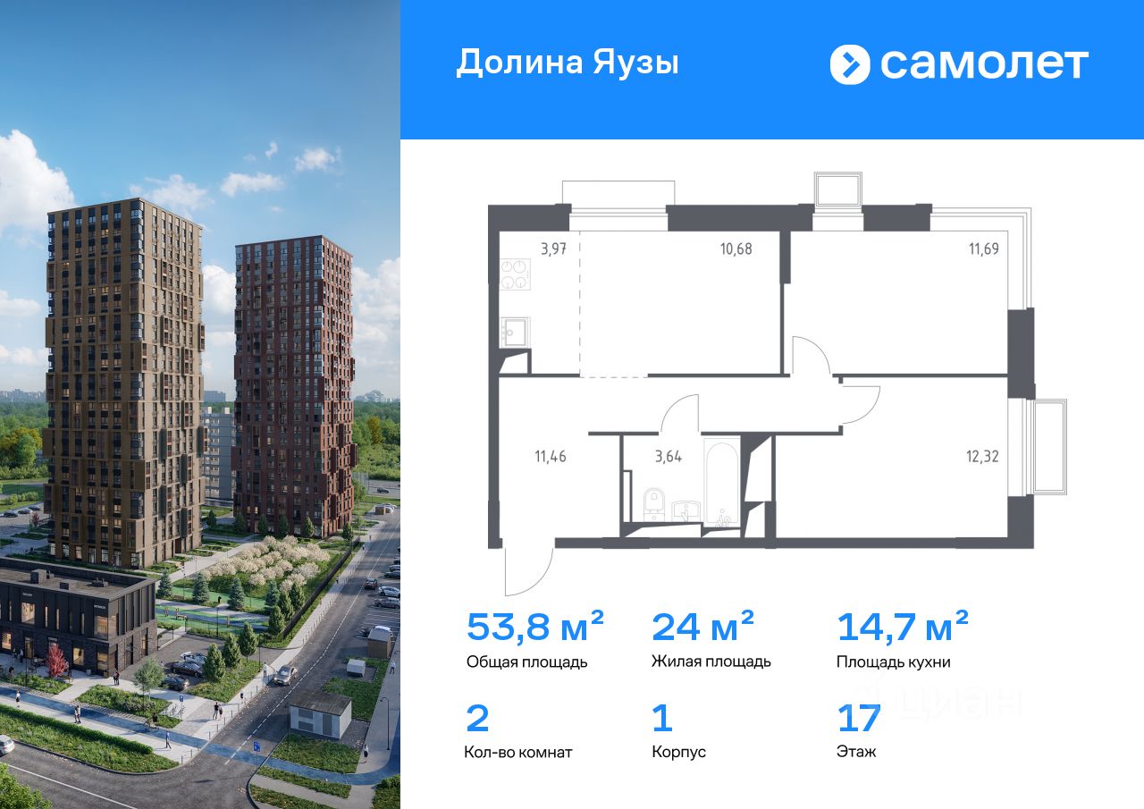 Строим кварталы для жизни с заботой о будущем. Предлагается 2-комнатная квартира комфорт-класса 53,76 кв.м в корпусе 1 на 17 этаже, в ЖК ''Долина Яузы'' Квартира с чистовой отделкой. Доступность дополнительных опций уточняйте у застройщика.
