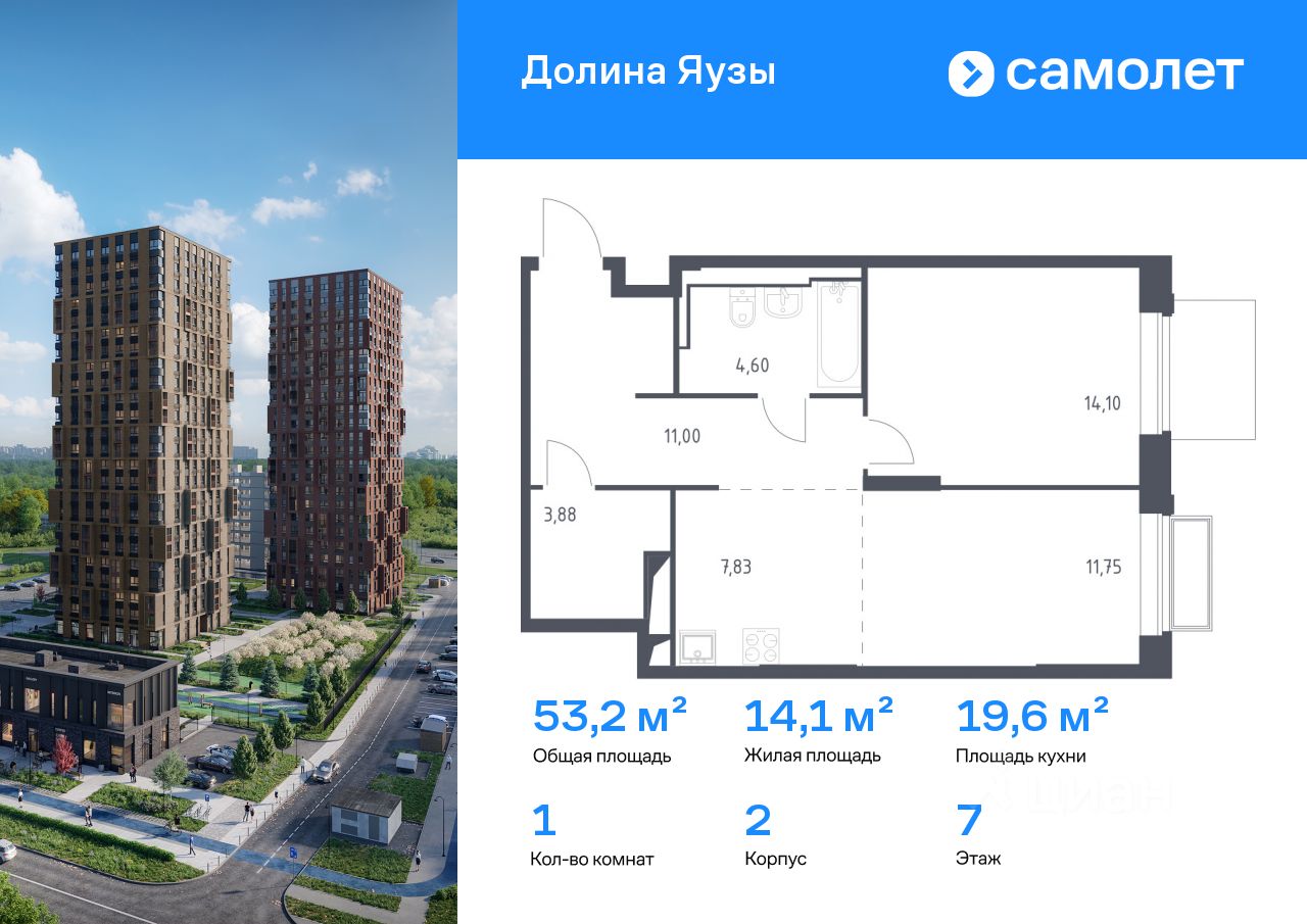Строим кварталы для жизни с заботой о будущем. Предлагается 1-комнатная квартира комфорт-класса 53,16 кв.м в корпусе 2 на 7 этаже, в ЖК ''Долина Яузы'' Квартира с чистовой отделкой. Доступность дополнительных опций уточняйте у застройщика.