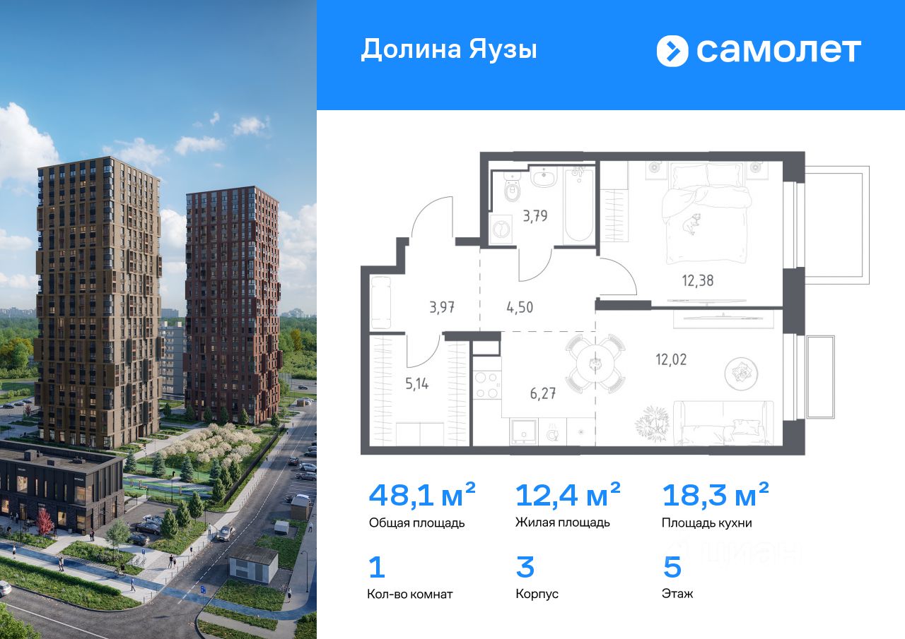 Строим кварталы для жизни с заботой о будущем. Предлагается 1-комнатная квартира комфорт-класса 48,07 кв.м в корпусе 3 на 5 этаже, в ЖК ''Долина Яузы'' Квартира с чистовой отделкой. Доступность дополнительных опций уточняйте у застройщика.