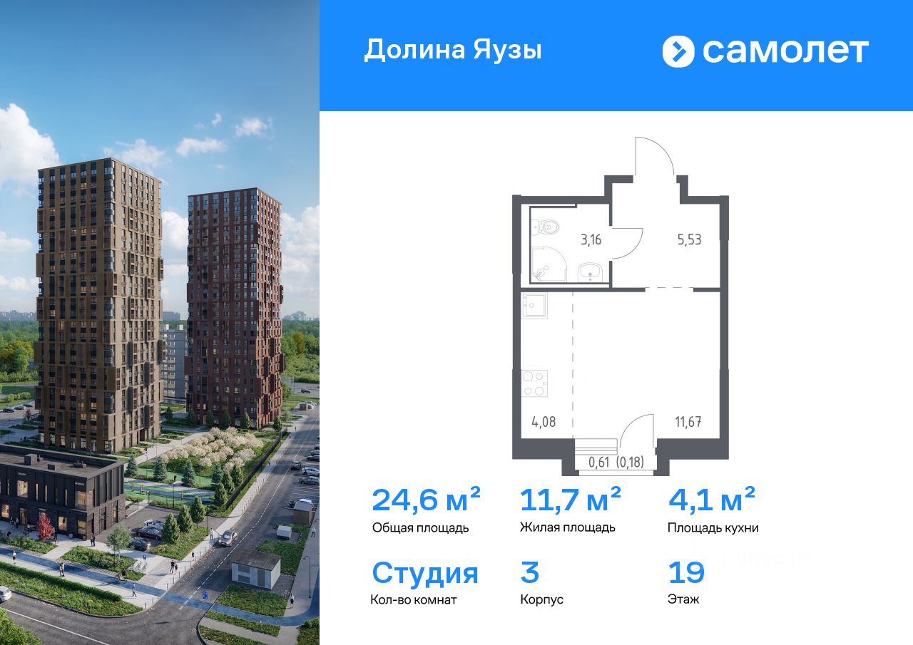 Строим кварталы для жизни с заботой о будущем. Предлагается квартира студия комфорт-класса 24,62 кв.м в корпусе 3 на 19 этаже, в ЖК ''Долина Яузы'' Квартира с предчистовой отделкой. Доступность дополнительных опций уточняйте у застройщика.