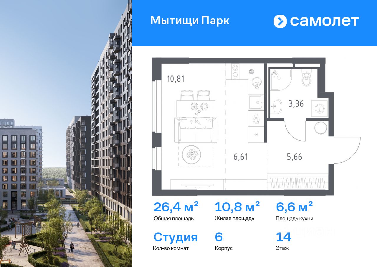 Строим кварталы для жизни с заботой о будущем. Предлагается квартира студия комфорт-класса 26,44 кв.м в корпусе 6 на 14 этаже, в ЖК ''Мытищи Парк'' Квартира без отделки. Доступность опции ''отделка'' и возможность комплектации мебелью и декором уточняйте у застройщика.