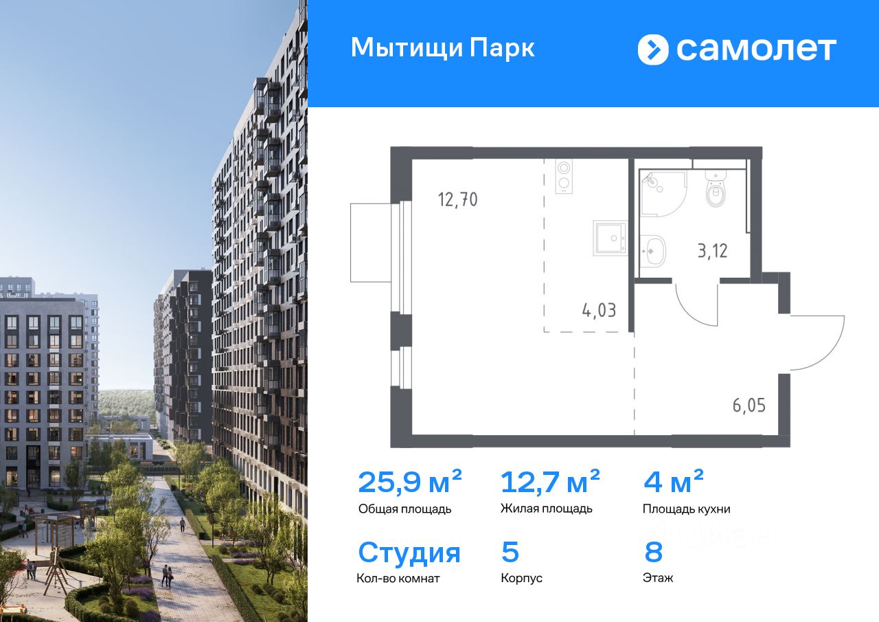 Строим кварталы для жизни с заботой о будущем. Предлагается квартира студия комфорт-класса 25,9 кв.м в корпусе 5 на 8 этаже, в ЖК ''Мытищи Парк''