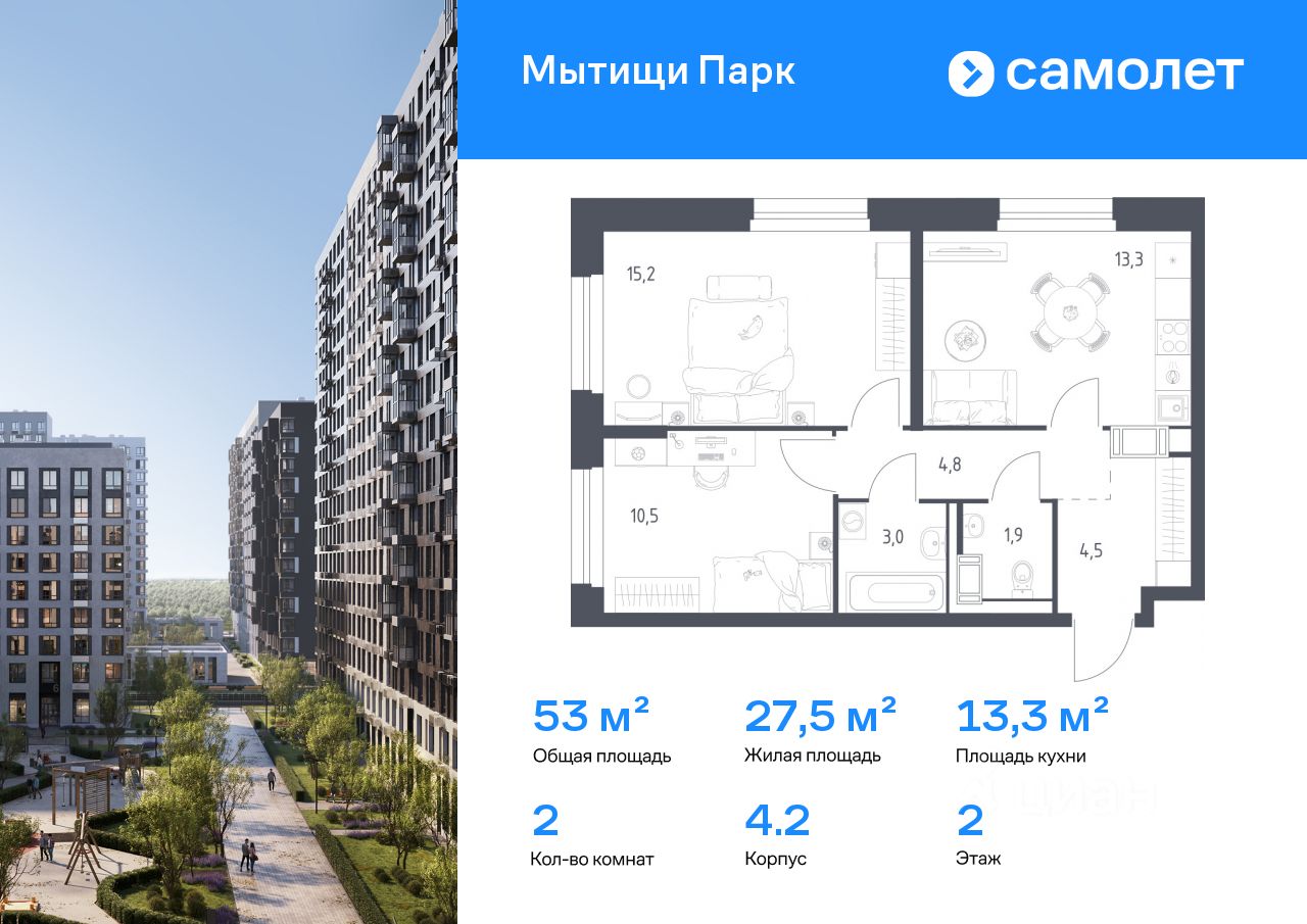 Строим кварталы для жизни с заботой о будущем. Предлагается 2-комнатная квартира комфорт-класса 53 кв.м в корпусе 4.2 на 2 этаже, в ЖК ''Мытищи Парк''