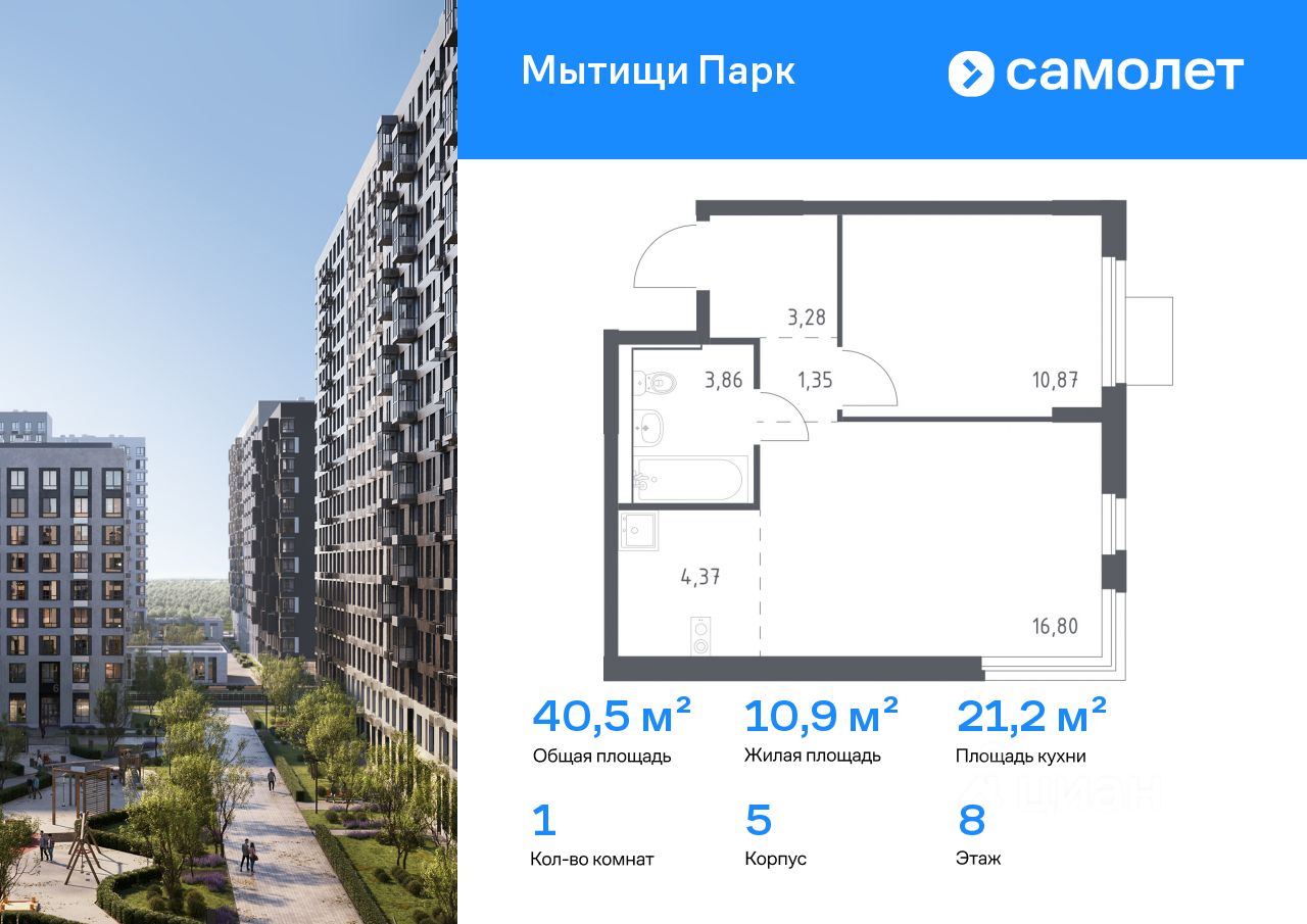 Строим кварталы для жизни с заботой о будущем. Предлагается 1-комнатная квартира комфорт-класса 40,53 кв.м в корпусе 5 на 8 этаже, в ЖК ''Мытищи Парк''