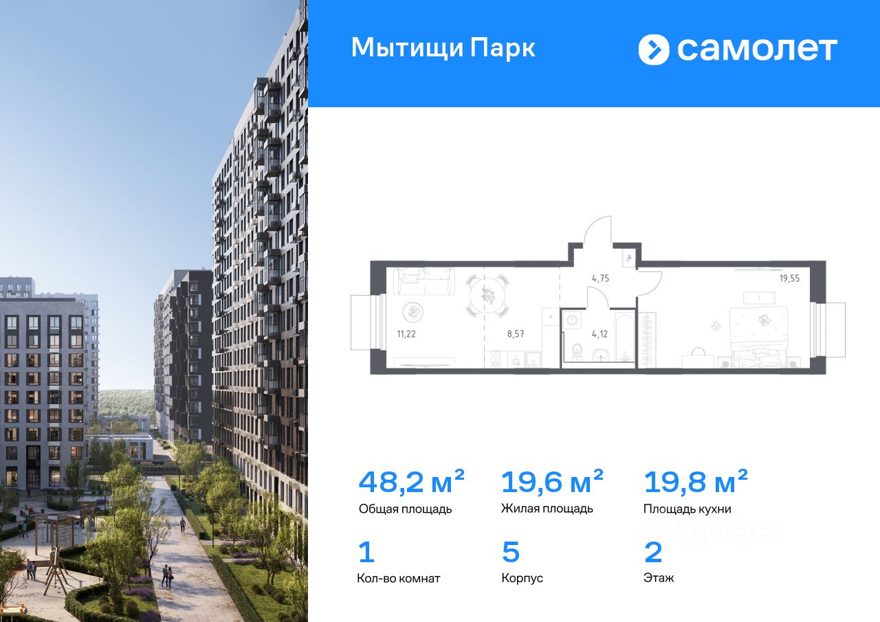 Строим кварталы для жизни с заботой о будущем. Предлагается 1-комнатная квартира комфорт-класса 48,21 кв.м в корпусе 5 на 2 этаже, в ЖК ''Мытищи Парк''