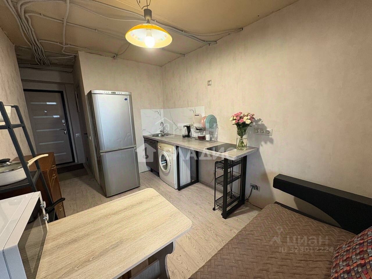 Общая площадь квартиры 34,6 м. Жилая площадь составляет 18 кв. м, площадь кухни — 10 кв. м. В квартире сделан косметический ремонт, есть большая лоджия. Окна выходят на улицу. Совмещённый санузел. В квартире есть все неоходимое для жизни: раскладной диван в комнате, большой шкаф, места для хранения, стиральная машина, холодильник, микроволновка.