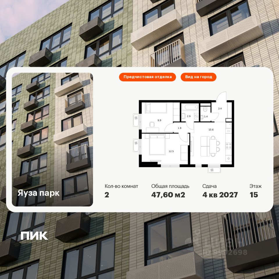 Продаётся 2-комн. квартира площадью 47,6 кв.м на 15 этаже 24 этажного дома (Корпус 12, Секция 1) проекта ПИК Яуза парк. Светлый просторный подъезд на уровне земли, функциональная планировка, большие окна, предчистовая отделка.