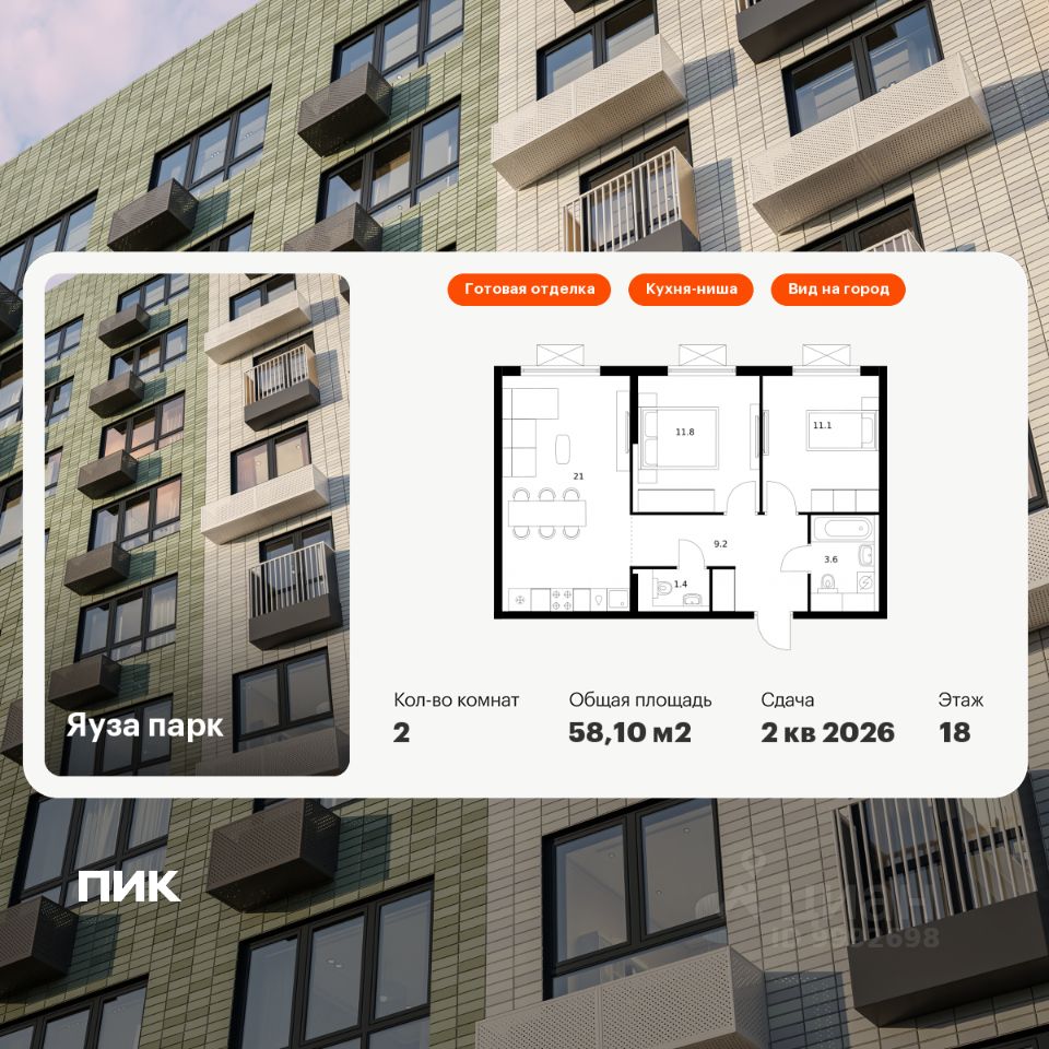 Продаётся 2-комн. квартира площадью 58,1 кв.м на 18 этаже 24 этажного дома (Корпус 5, Секция 1) проекта ПИК Яуза парк. Светлый просторный подъезд на уровне земли, функциональная планировка, большие окна, c отделкой.