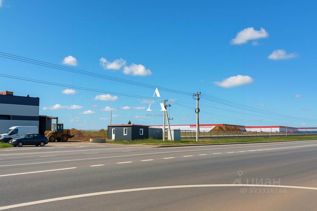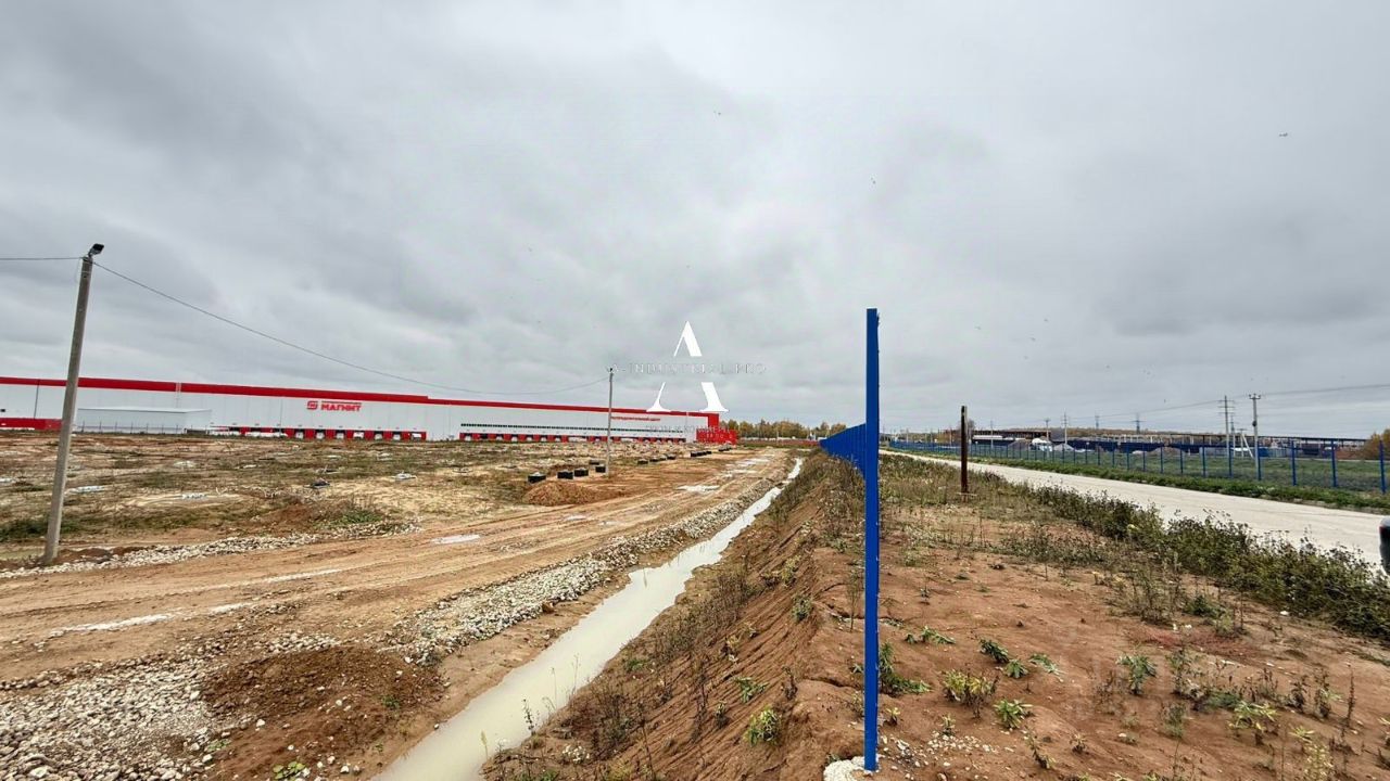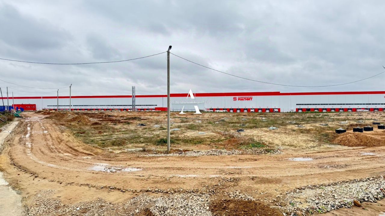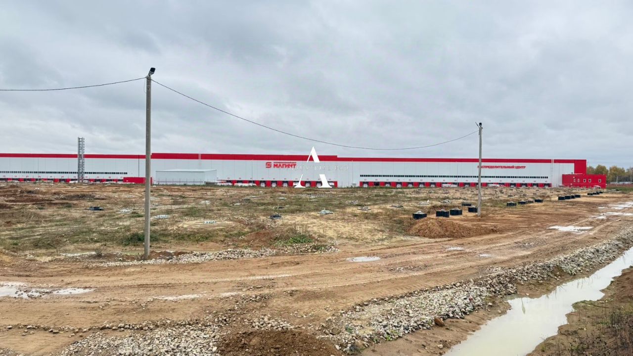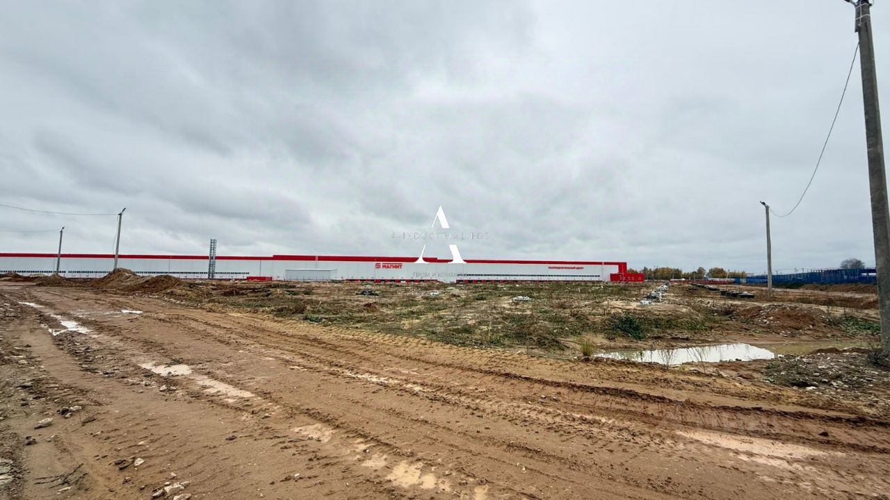 Участок с действующим РНС для производственно-складского здания общей площадью 20835 кв.м. Участок полностью огорожен, плодородный слой снят. Имеются строительные бытовки. На земельном участке установлены бетонные опоры фундамента.
