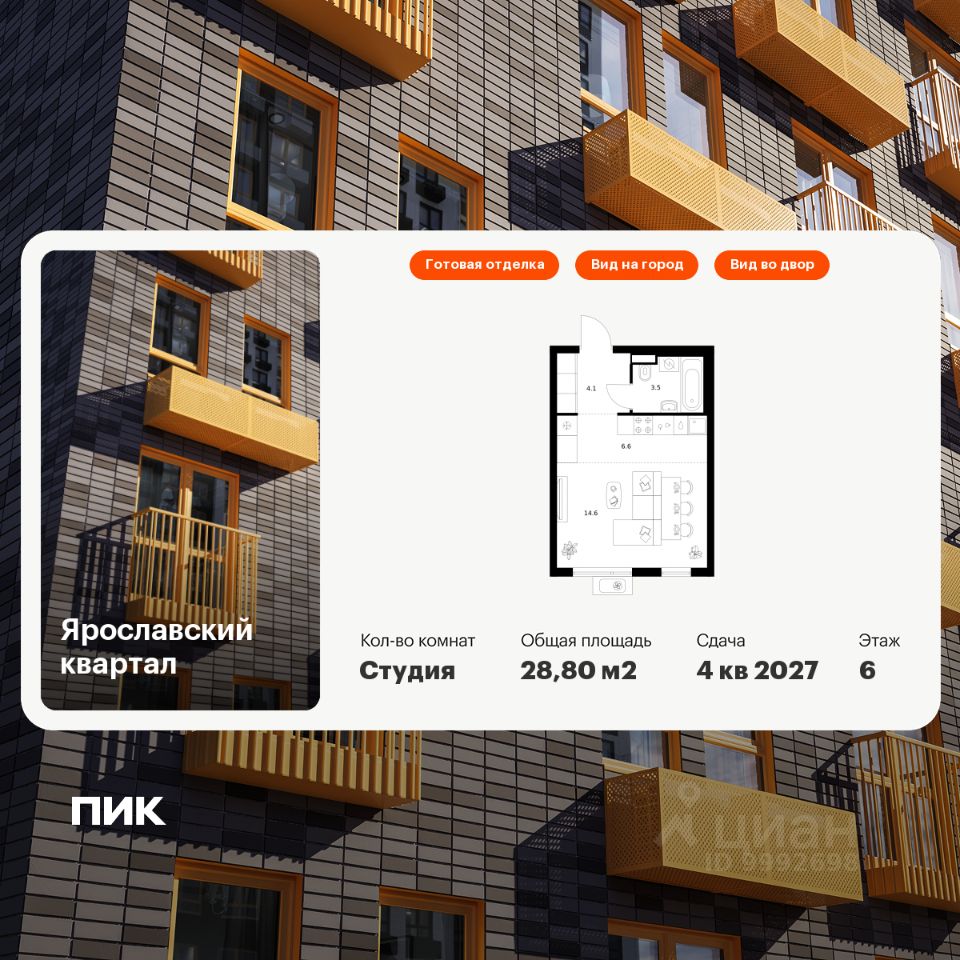 Продаётся квартира-студия площадью 28,8 кв.м на 6 этаже 25 этажного дома (Корпус 2.2, Секция 1) проекта ПИК Ярославский квартал. Светлый просторный подъезд на уровне земли, функциональная планировка, большие окна, c отделкой.