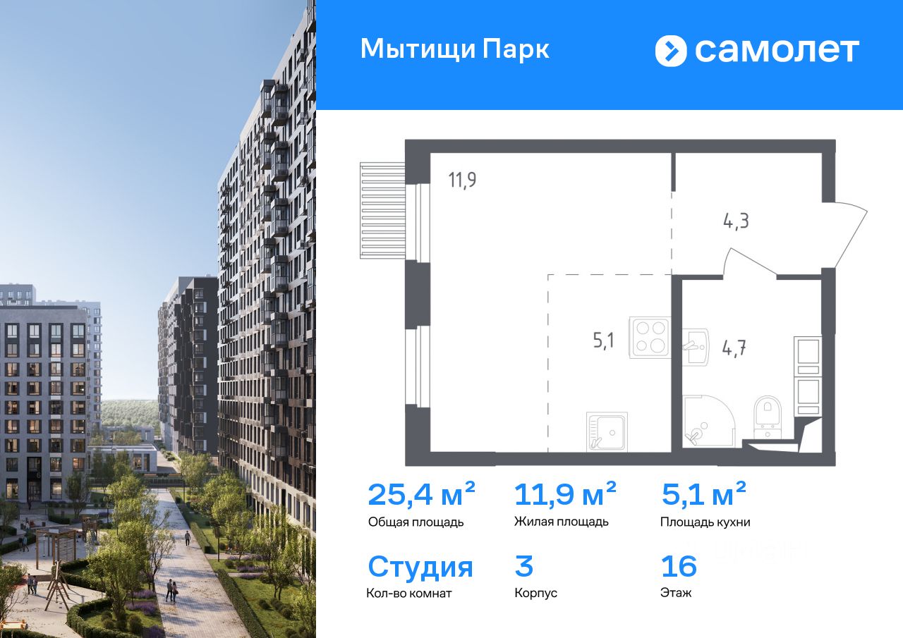 Строим кварталы для жизни с заботой о будущем. Предлагается квартира студия комфорт-класса 25,4 кв.м в корпусе 3 на 16 этаже, в ЖК ''Мытищи Парк''
