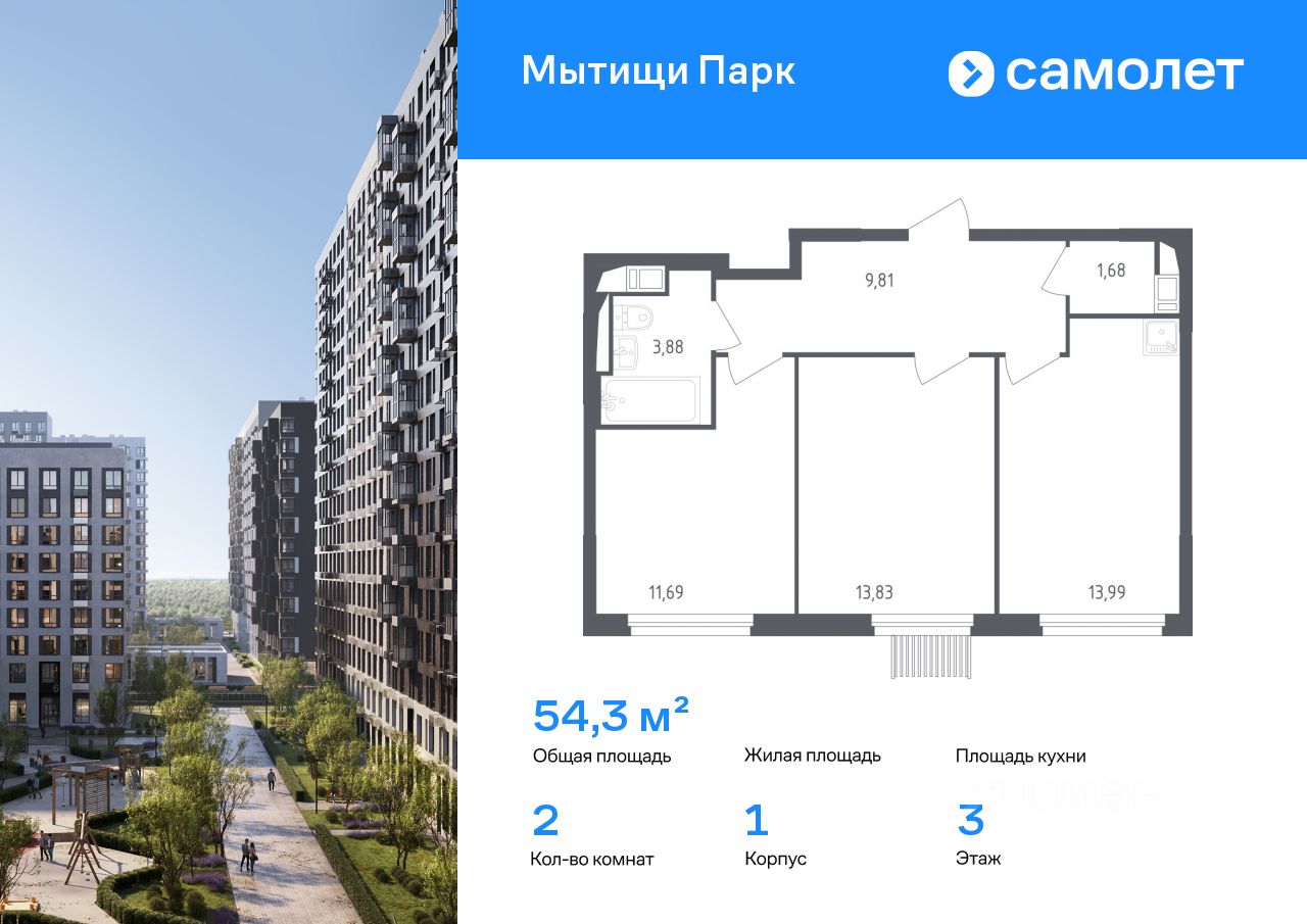 Строим кварталы для жизни с заботой о будущем. Предлагается 2-комнатная квартира комфорт-класса 54,3 кв.м в корпусе 1 на 3 этаже, в ЖК ''Мытищи Парк''