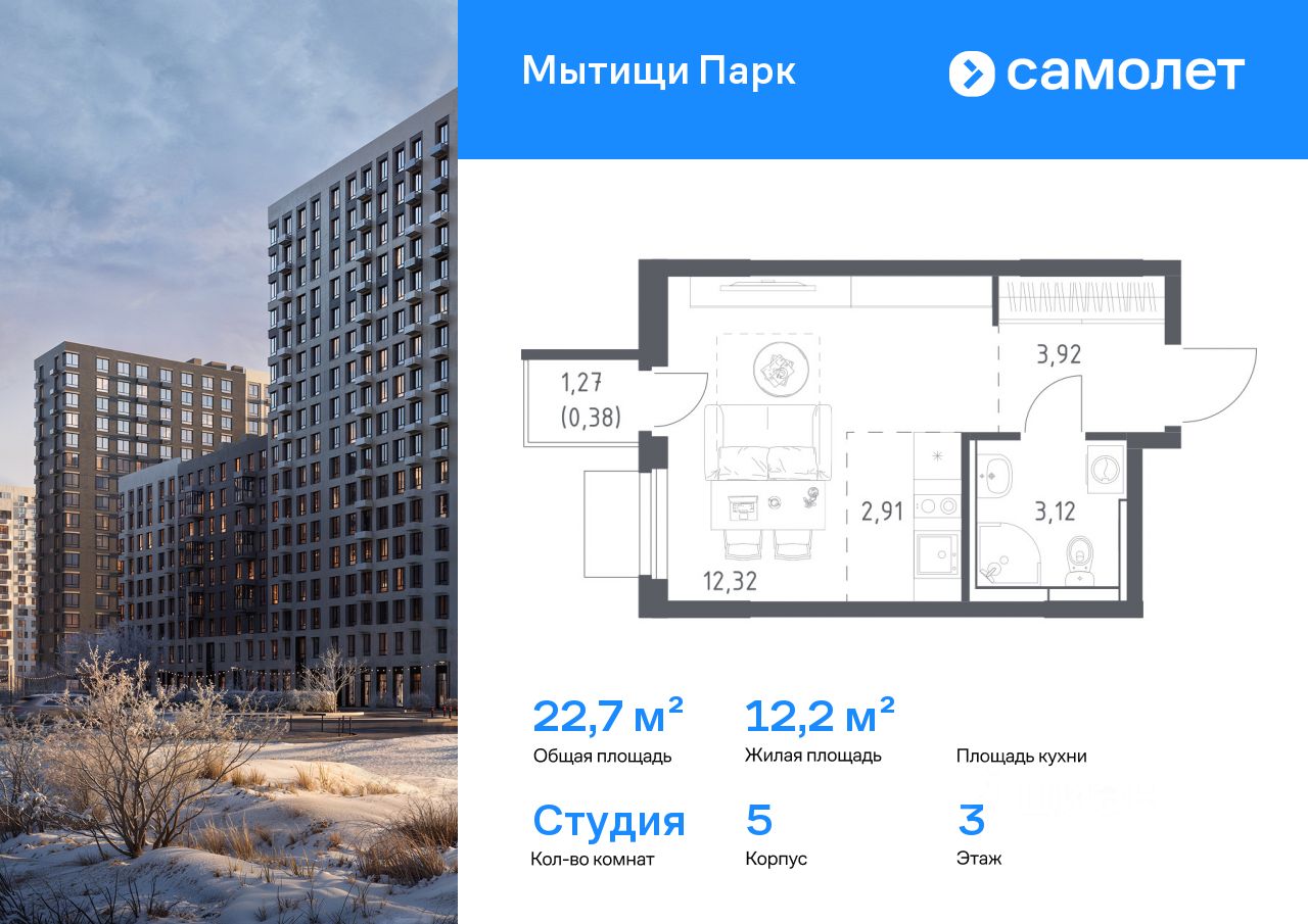 Строим кварталы для жизни с заботой о будущем. Предлагается квартира студия комфорт-класса 22,65 кв.м в корпусе 5 на 3 этаже, в ЖК ''Мытищи Парк''