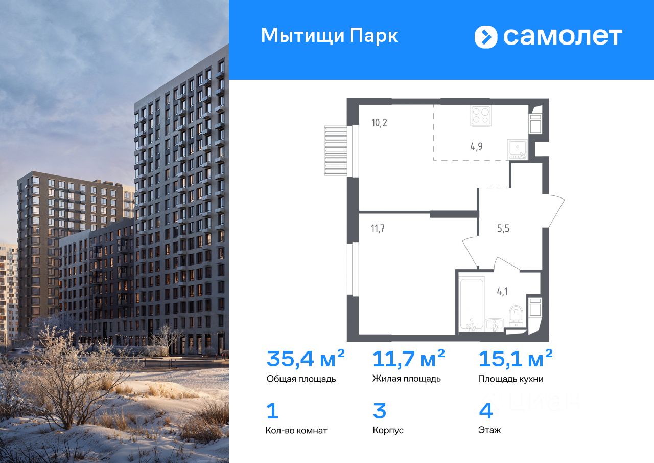 Строим кварталы для жизни с заботой о будущем. Предлагается 1-комнатная квартира комфорт-класса 35,4 кв.м в корпусе 3 на 4 этаже, в ЖК ''Мытищи Парк''
