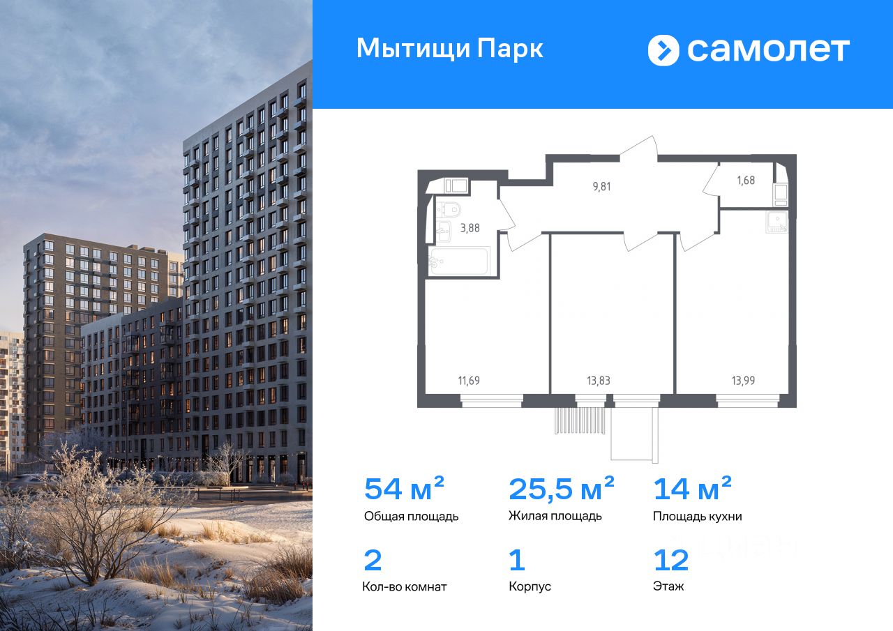 Строим кварталы для жизни с заботой о будущем. Предлагается 2-комнатная квартира комфорт-класса 54 кв.м в корпусе 1 на 12 этаже, в ЖК ''Мытищи Парк''