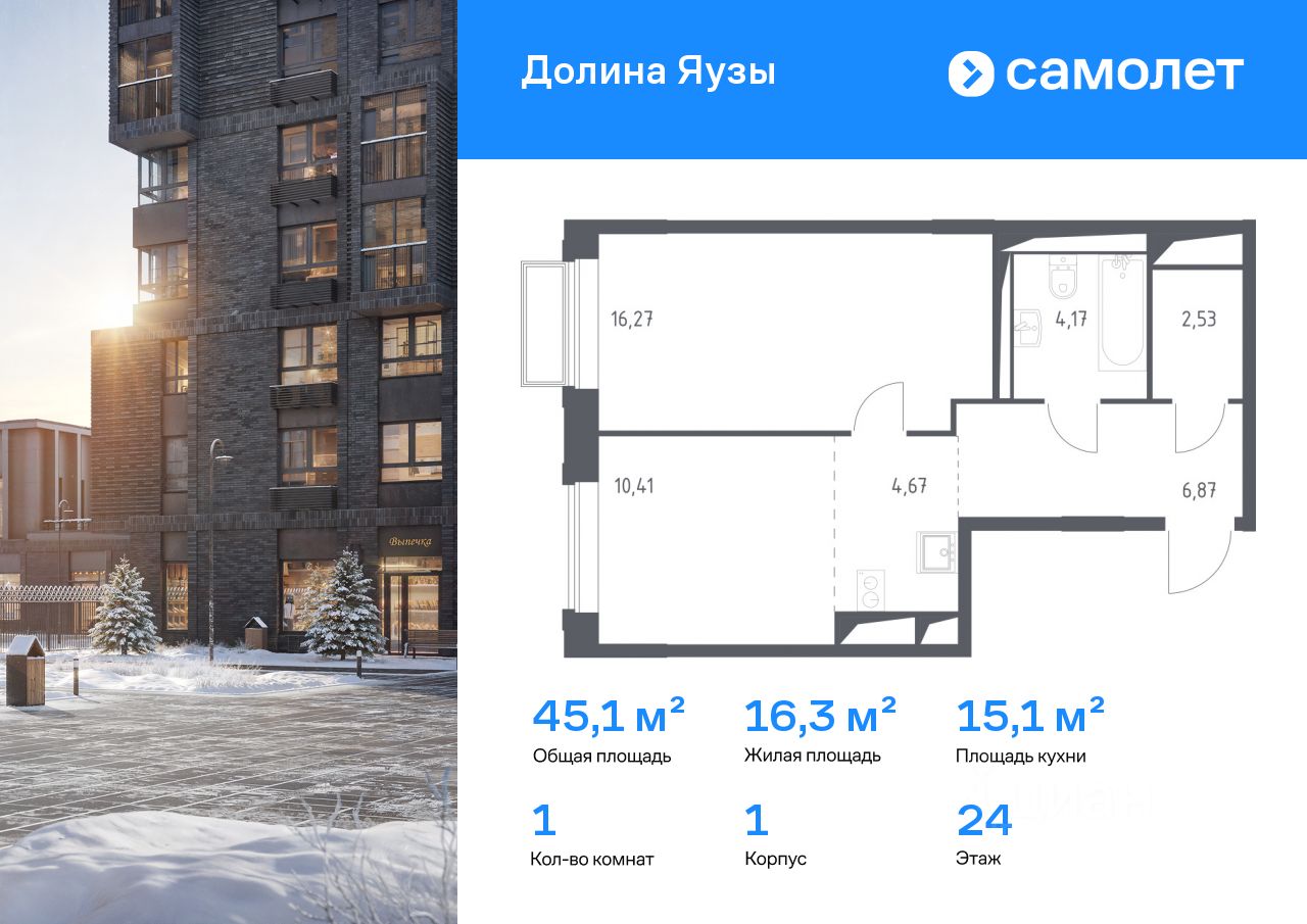 Строим кварталы для жизни с заботой о будущем. Предлагается 1-комнатная квартира комфорт-класса 45,1 кв.м в корпусе 1 на 24 этаже, в ЖК ''Долина Яузы'' Квартира с чистовой отделкой. Доступность дополнительных опций уточняйте у застройщика.