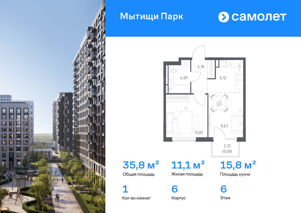 Строим кварталы для жизни с заботой о будущем. Предлагается 1-комнатная квартира комфорт-класса 35,82 кв.м в корпусе 6 на 6 этаже, в ЖК ''Мытищи Парк''