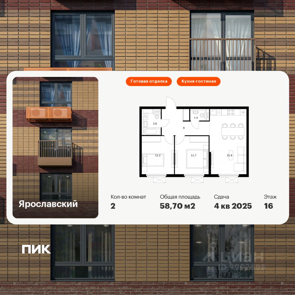Продаётся 2-комн. квартира площадью 58,7 кв.м на 16 этаже 25 этажного дома (Корпус 16.3, Секция 3) проекта ПИК Ярославский. Светлый просторный подъезд на уровне земли, функциональная планировка, большие окна, c отделкой.