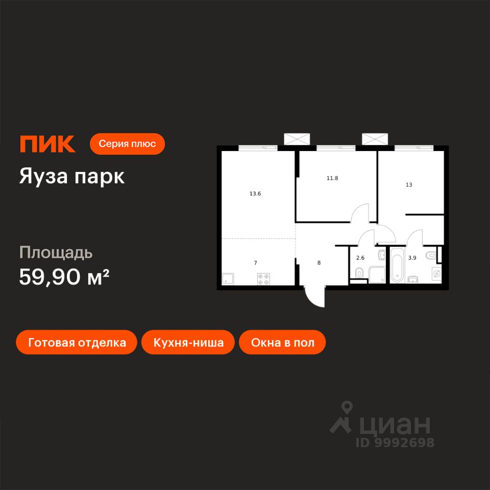 Продаётся 2-комн. квартира площадью 59,9 кв.м на 21 этаже 24 этажного дома (Корпус 7, Секция 1) проекта ПИК Яуза парк. Светлый просторный подъезд на уровне земли, функциональная планировка, большие окна, c отделкой.