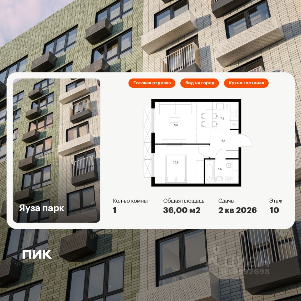 Продаётся 1-комн. квартира площадью 36 кв.м на 10 этаже 24 этажного дома (Корпус 5, Секция 1) проекта ПИК Яуза парк. Светлый просторный подъезд на уровне земли, функциональная планировка, большие окна, c отделкой.